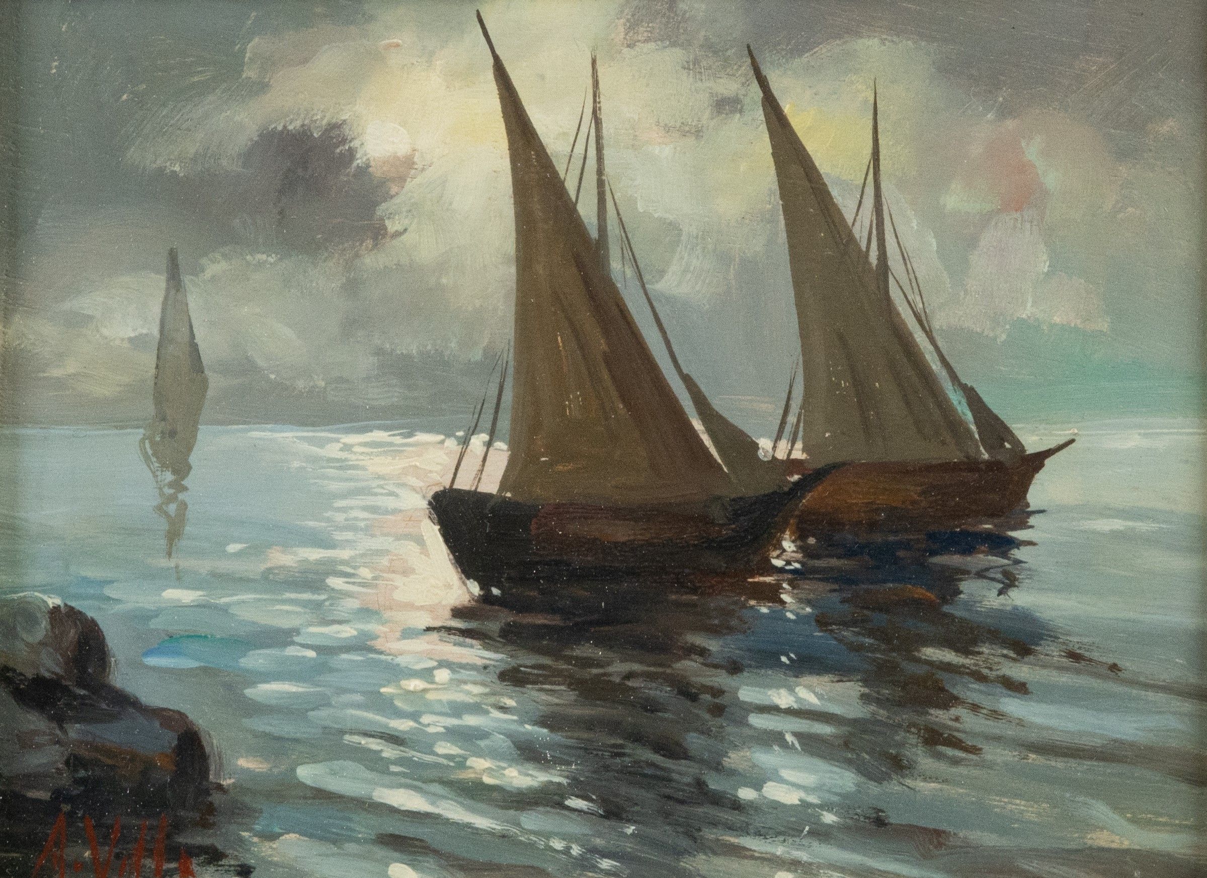 Vele: olio su tavola, cm. 18x24, firmato A. Villa in basso a sinistra.