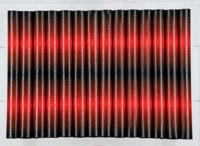 Tecnica mista su 14 tubi di tela arrotolata in teca di plexiglas, cm. 56x76x7,5