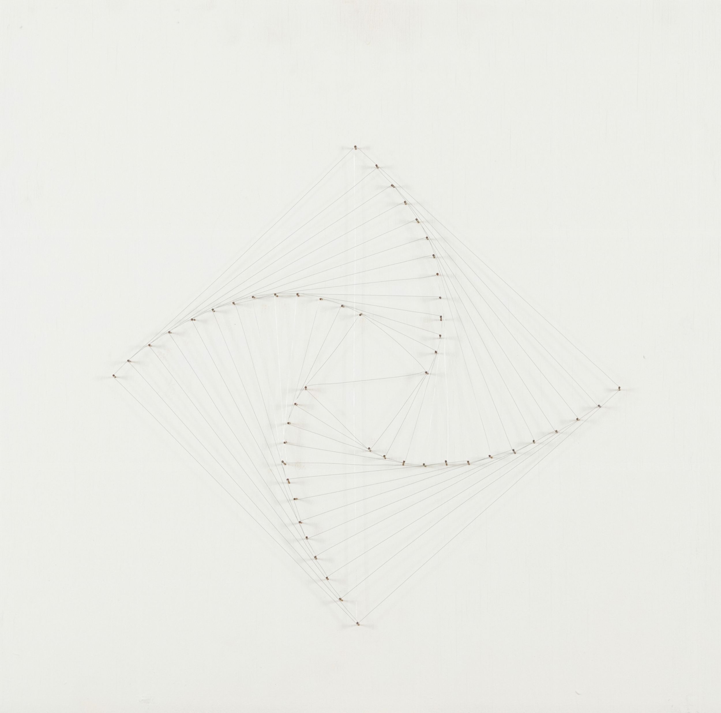 Chiodi e fili su tavola dipinta, cm. 60x61