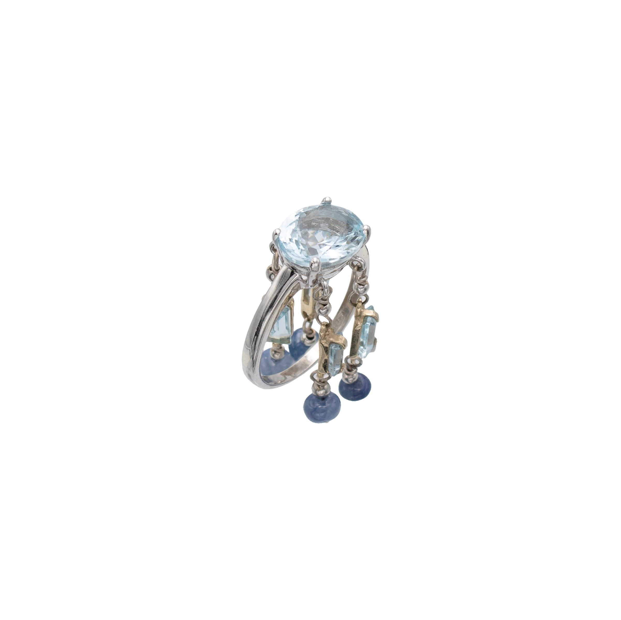 taglio ovale briolet, quattro pendenti con acquamarine taglio baguettes e zaffiri cabochon, misura 11