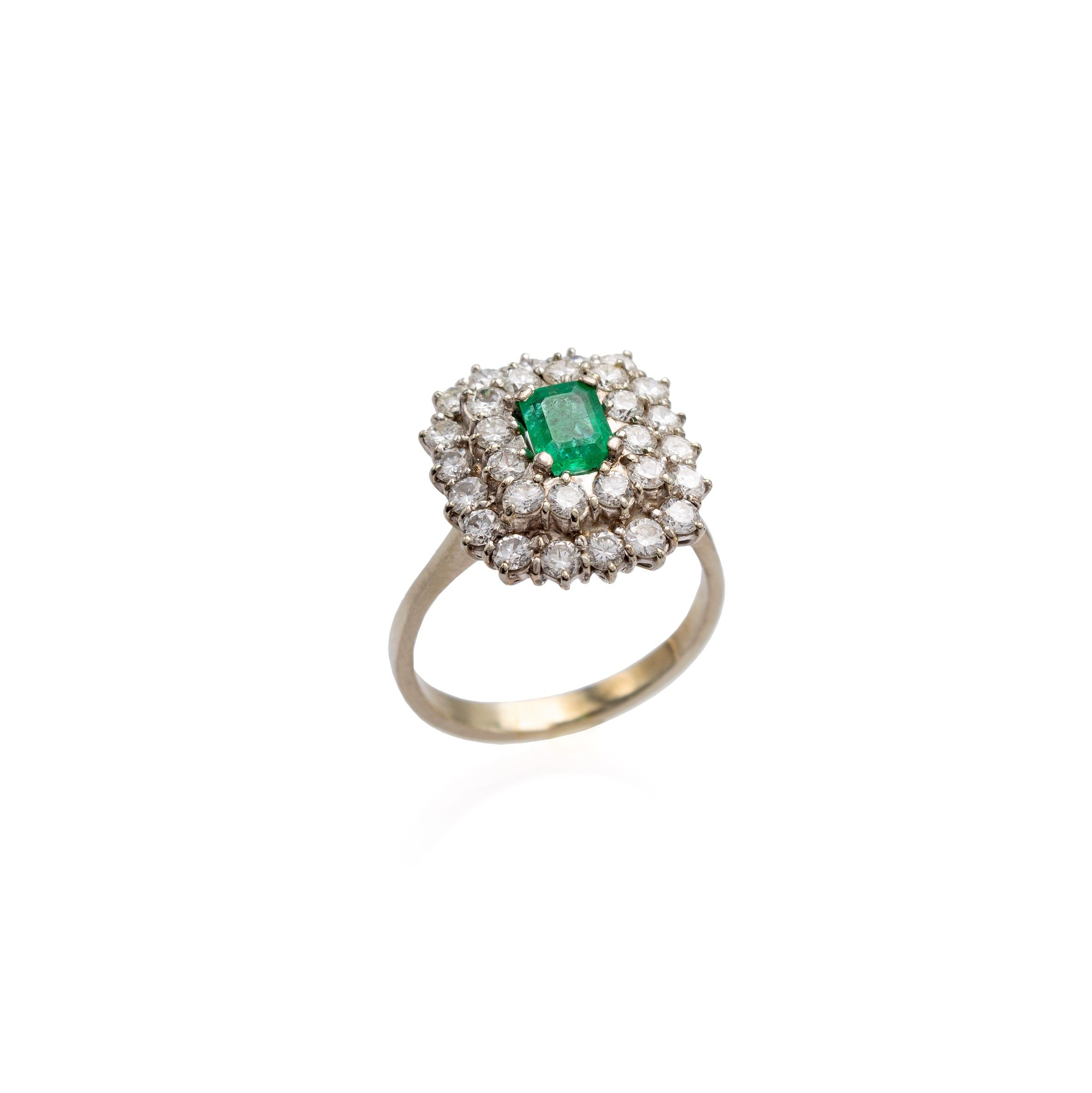 anni 40/50 smeraldo taglio ottagonale ct 0,25 circa contornato da diamanti taglio brillante ct 1 circa, misura 15