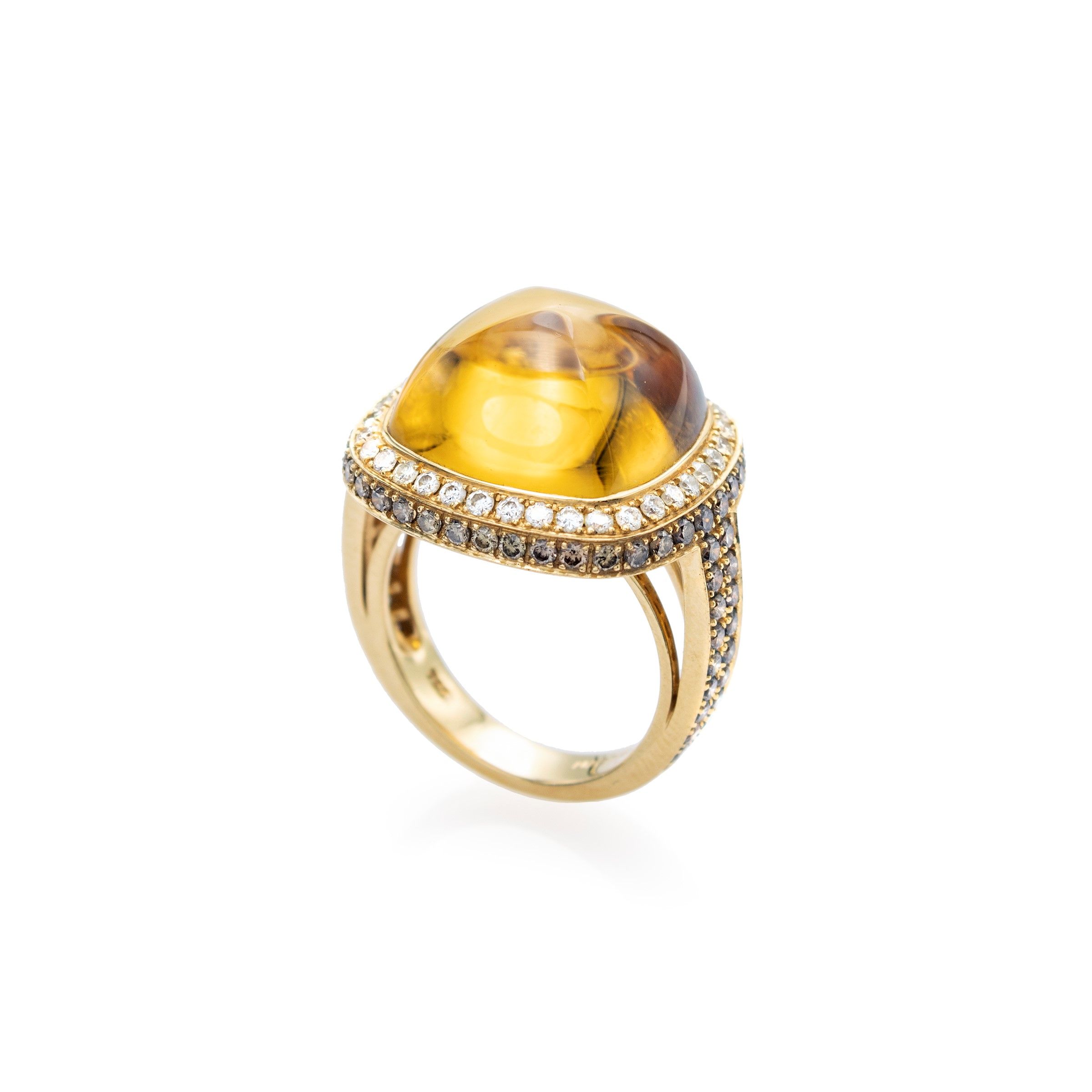 firmato Martini citrino taglio cabochon contornato da diamanti taglio brillante e fancy brown ct 1,50 circa, misura 14