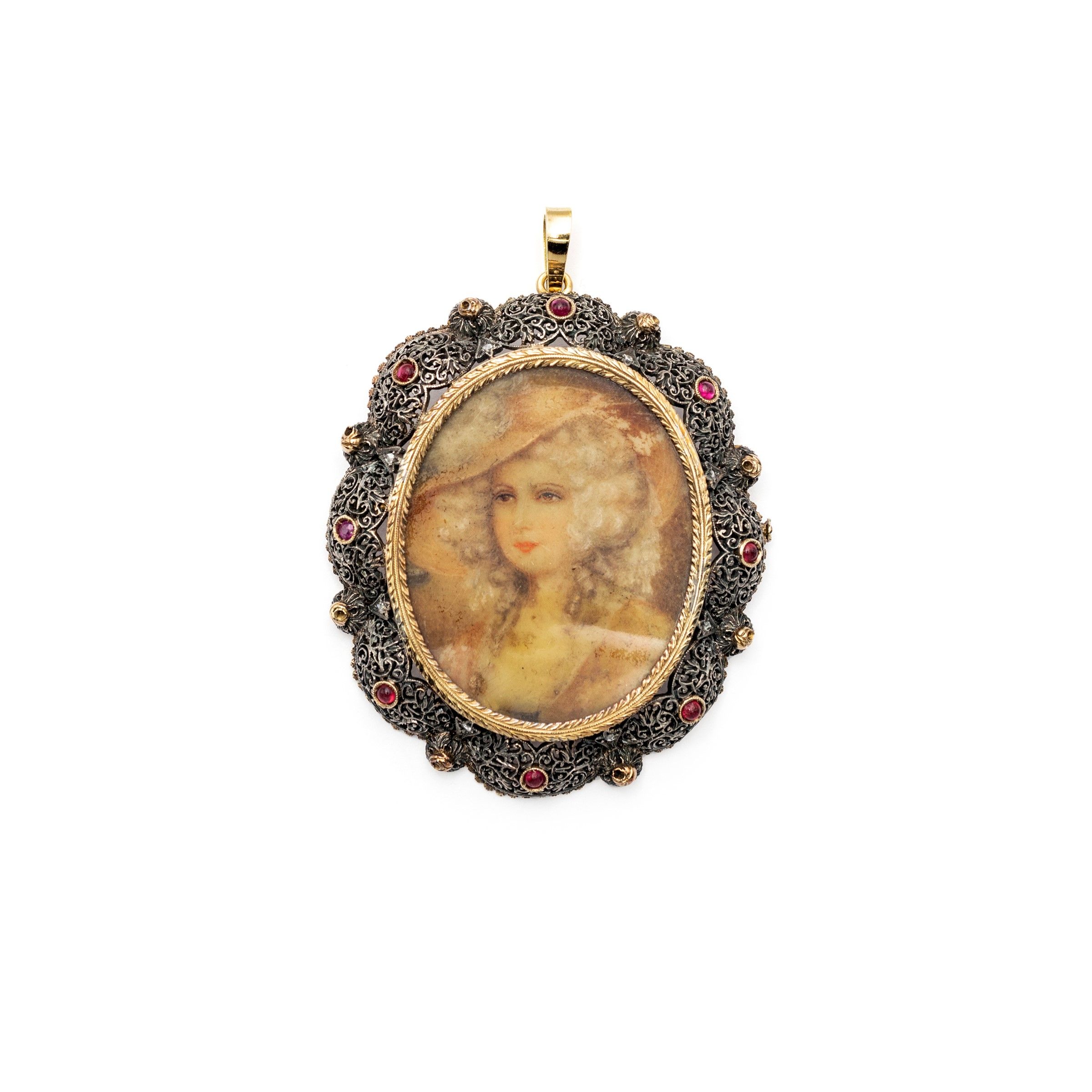 primi '900 impreziosita da rubini e rose di diamante, miniatura dipinta in policromia raffigurante volto femminile, misure 5,5x4,7 cm.