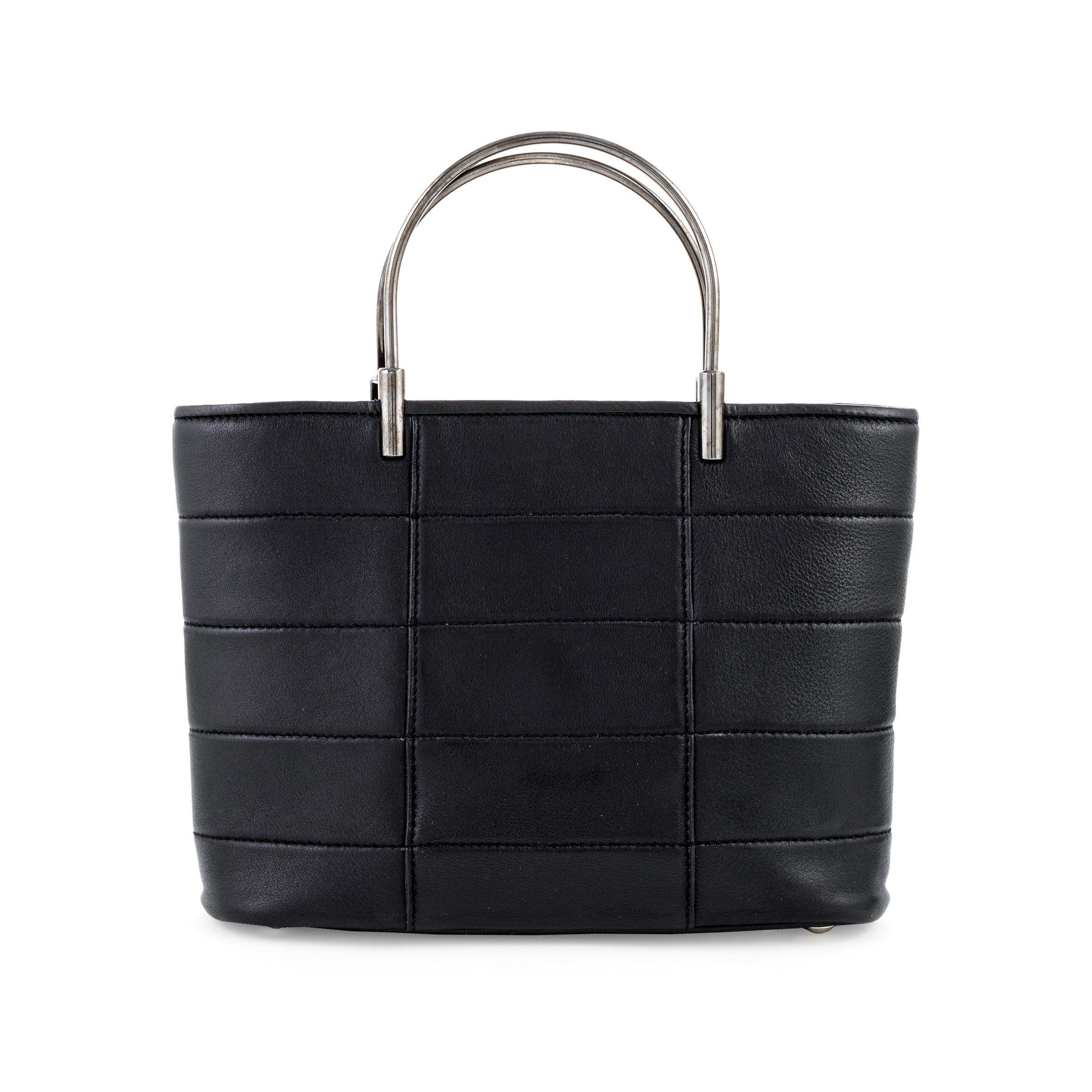 in pelle nera, finiture argentate, interno in camoscio ad uno scomparto con due tasche di cui una a zip e una tasca removibile, tracolla a mano a due manici chiusura a calamita, condizioni buone