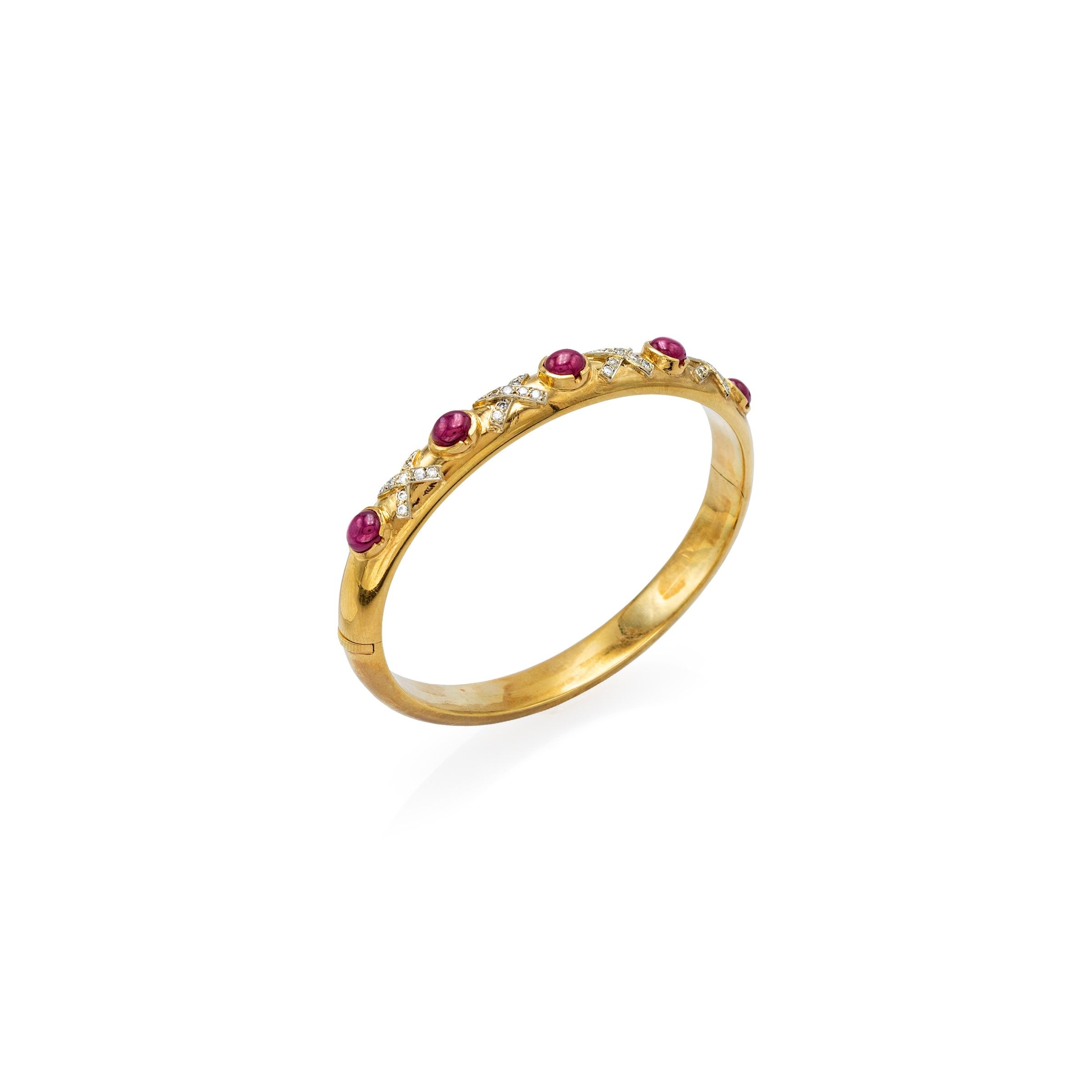nella parte superiore impreziosito da rubini taglio cabochon ct 2,50 circa alternati da diamanti taglio brillante ct 0,60 circa, chiusura a scatto, diametro 6 cm.