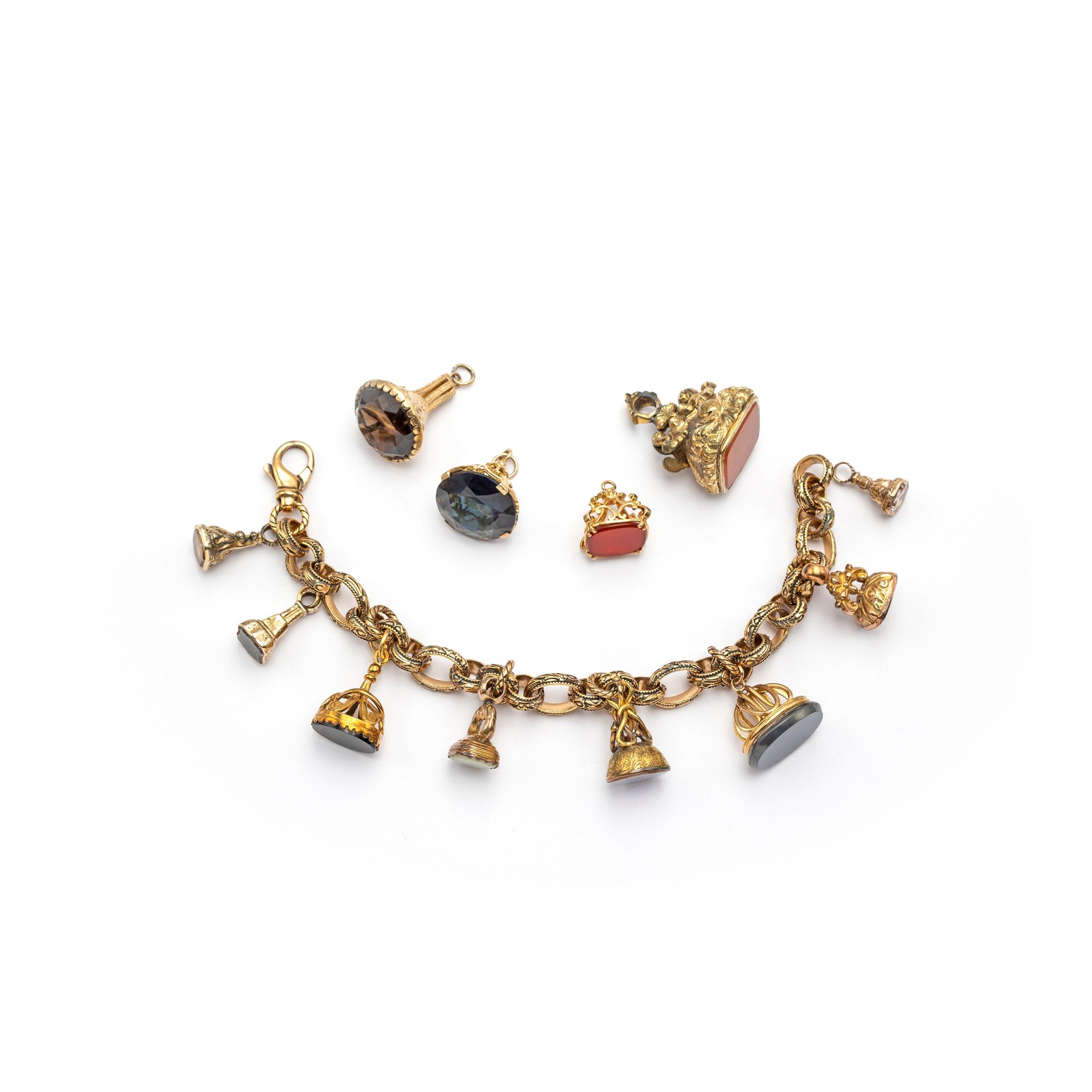 XIX - XX Sec. completo di sigilli sciolti da aggiungere, tutti realizzati in princisbecco e oro basso con pietre dure e quarzi, lunghezza 20 cm.