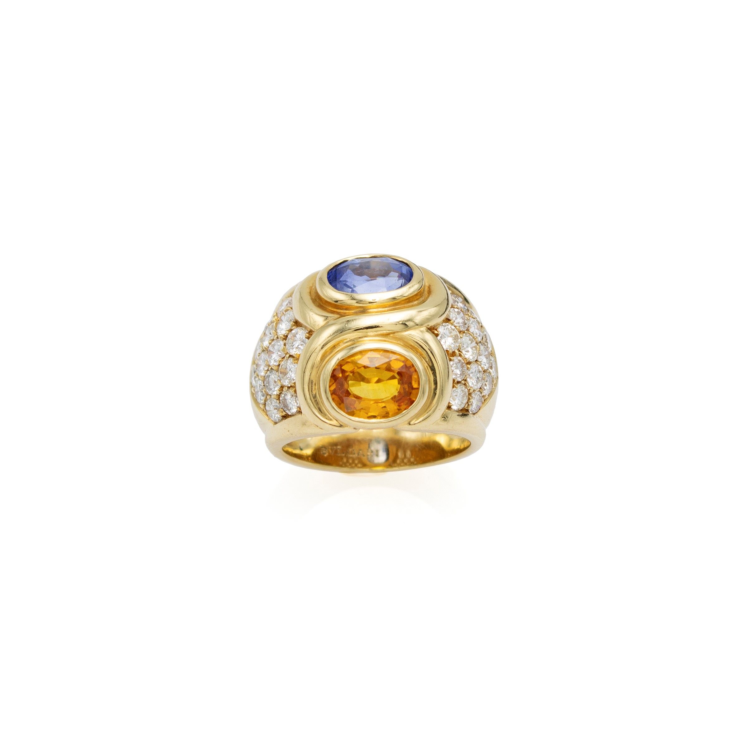 firmato zaffiro blu e giallo taglio ovale briolet ct 1,80 circa cadauno e diamanti taglio brillante ct 1,50 circa, misura 13