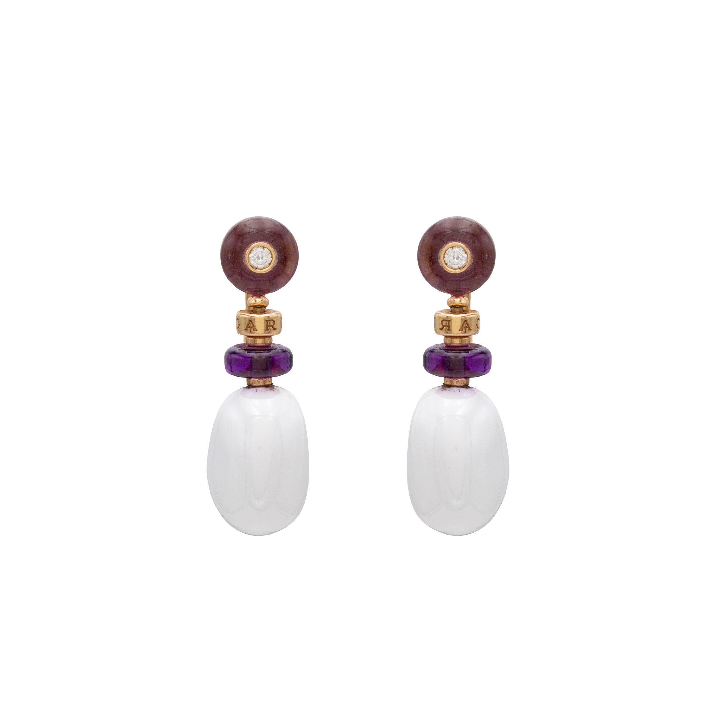 firmati e numerati in oro giallo 18kt ceramica bianca, ametiste e diamanti taglio brillante, lunghezza 3,5 cm. completi di scatola