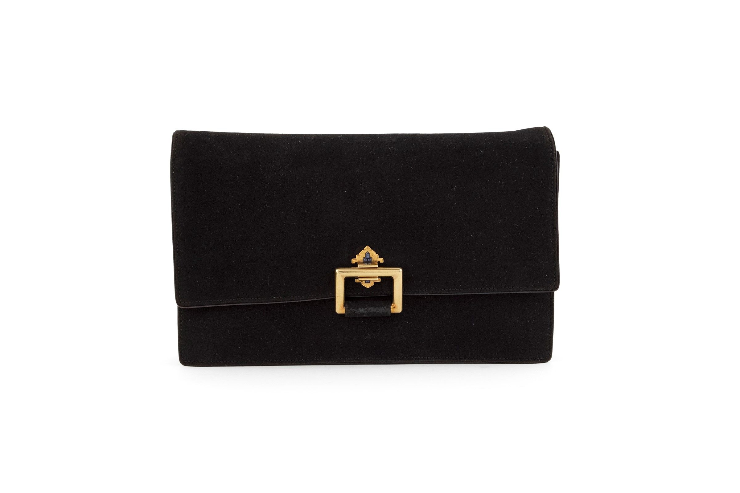 misure 22x12,5x5,5 cm. firmata e numerata, anni 40 circa in pelle di daino nero, chiusura a scatto in oro giallo 18kt e zaffiri taglio cabochon, finiture in pelle nera, interno ad uno scomparto con tre tasche, una tasca esterna anteriore, condizioni buone