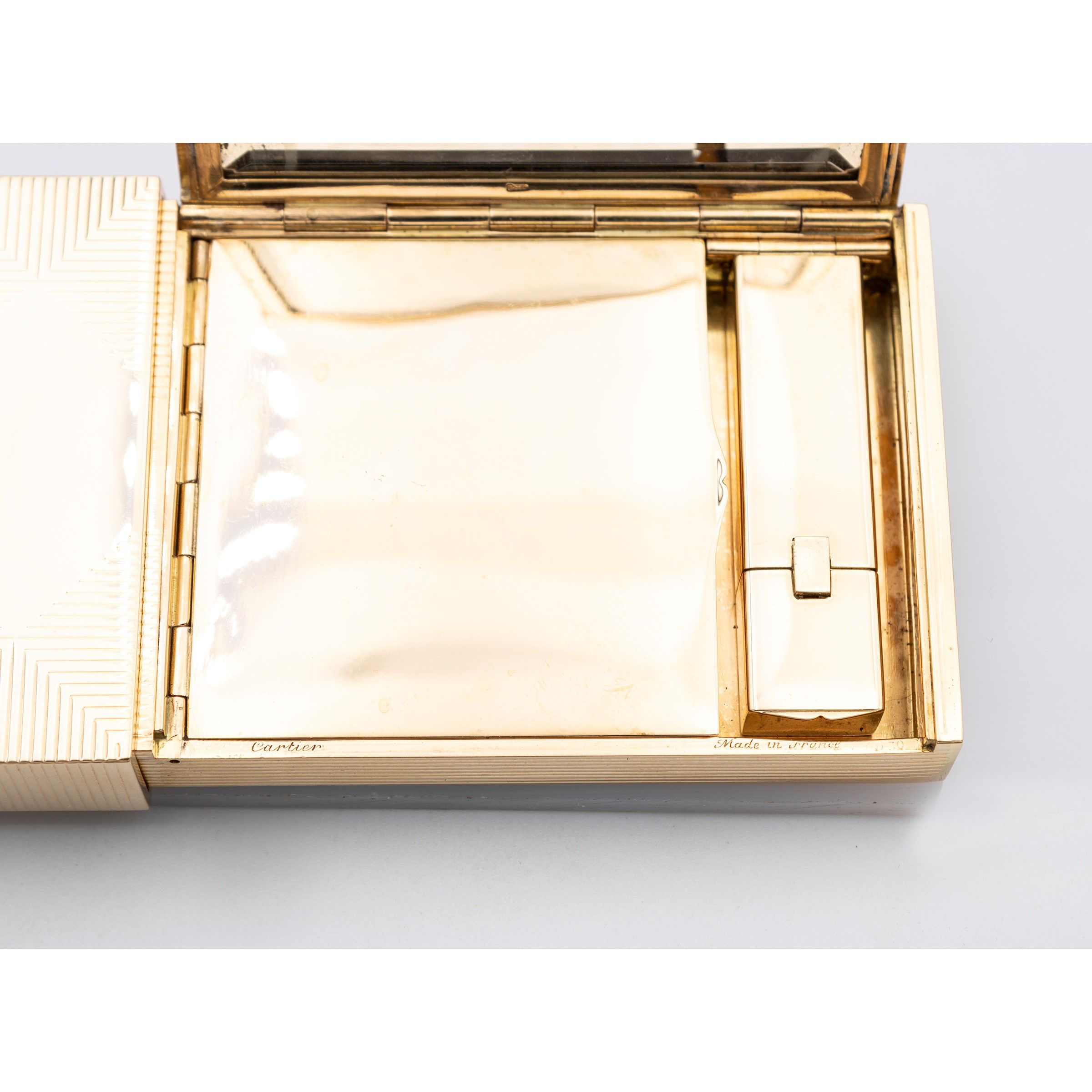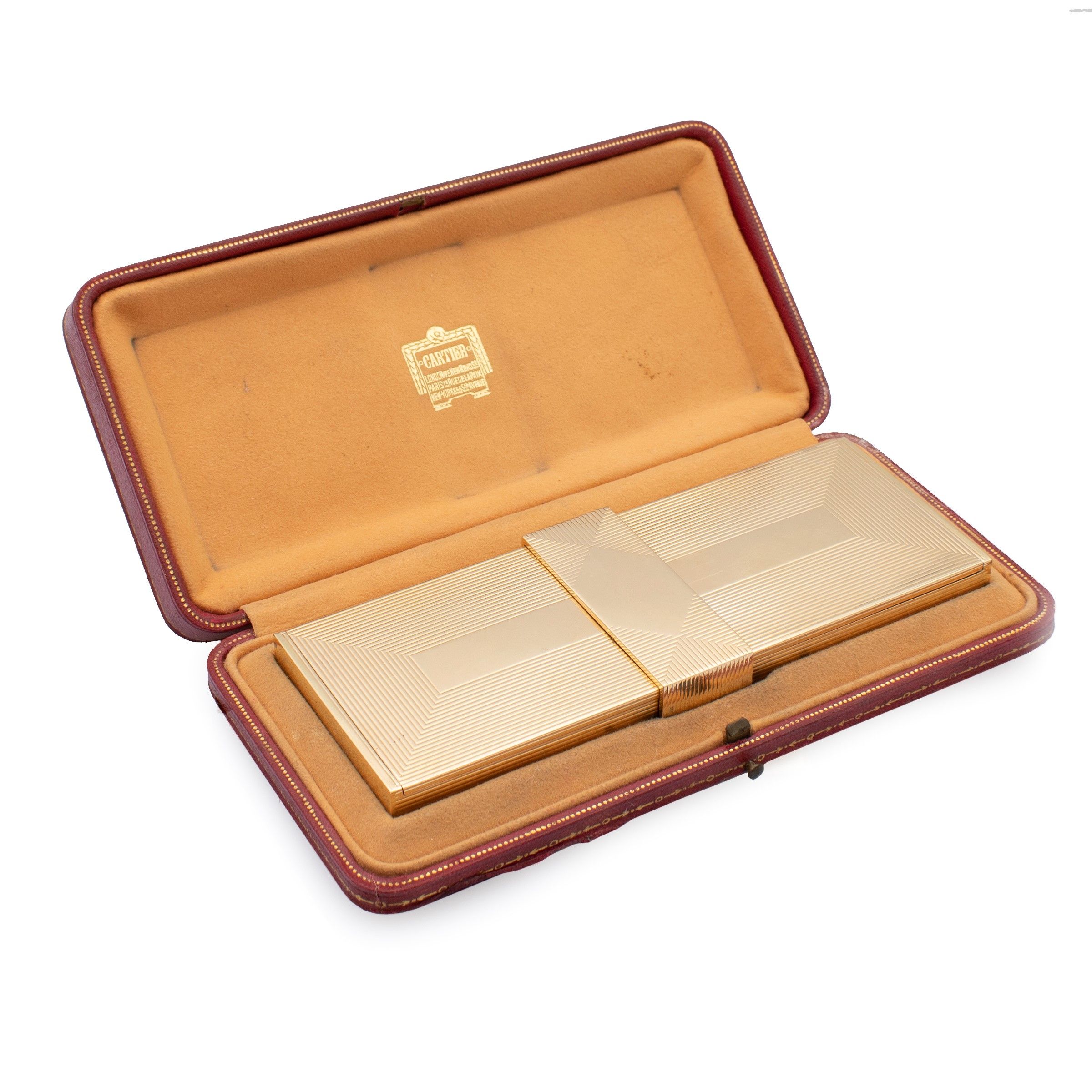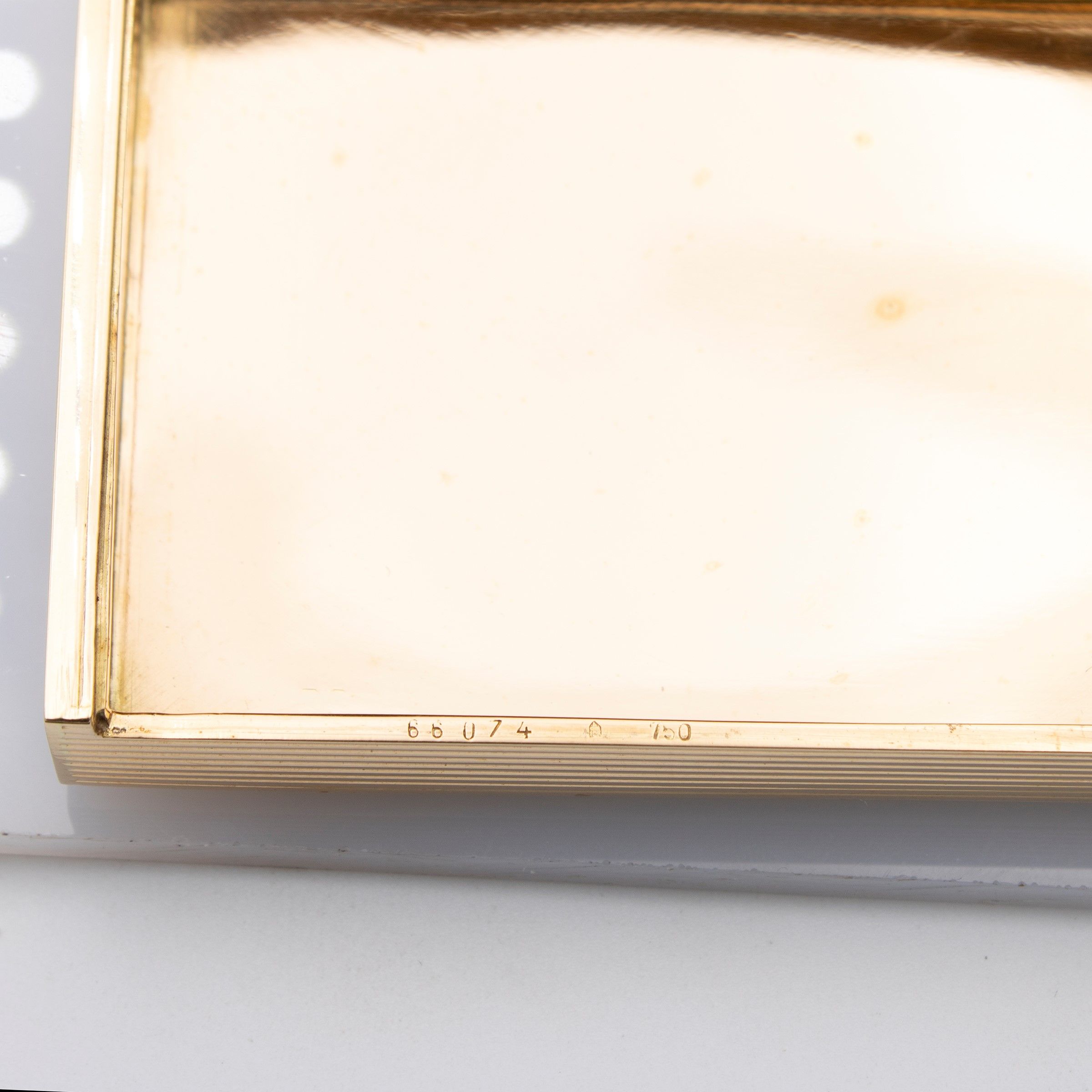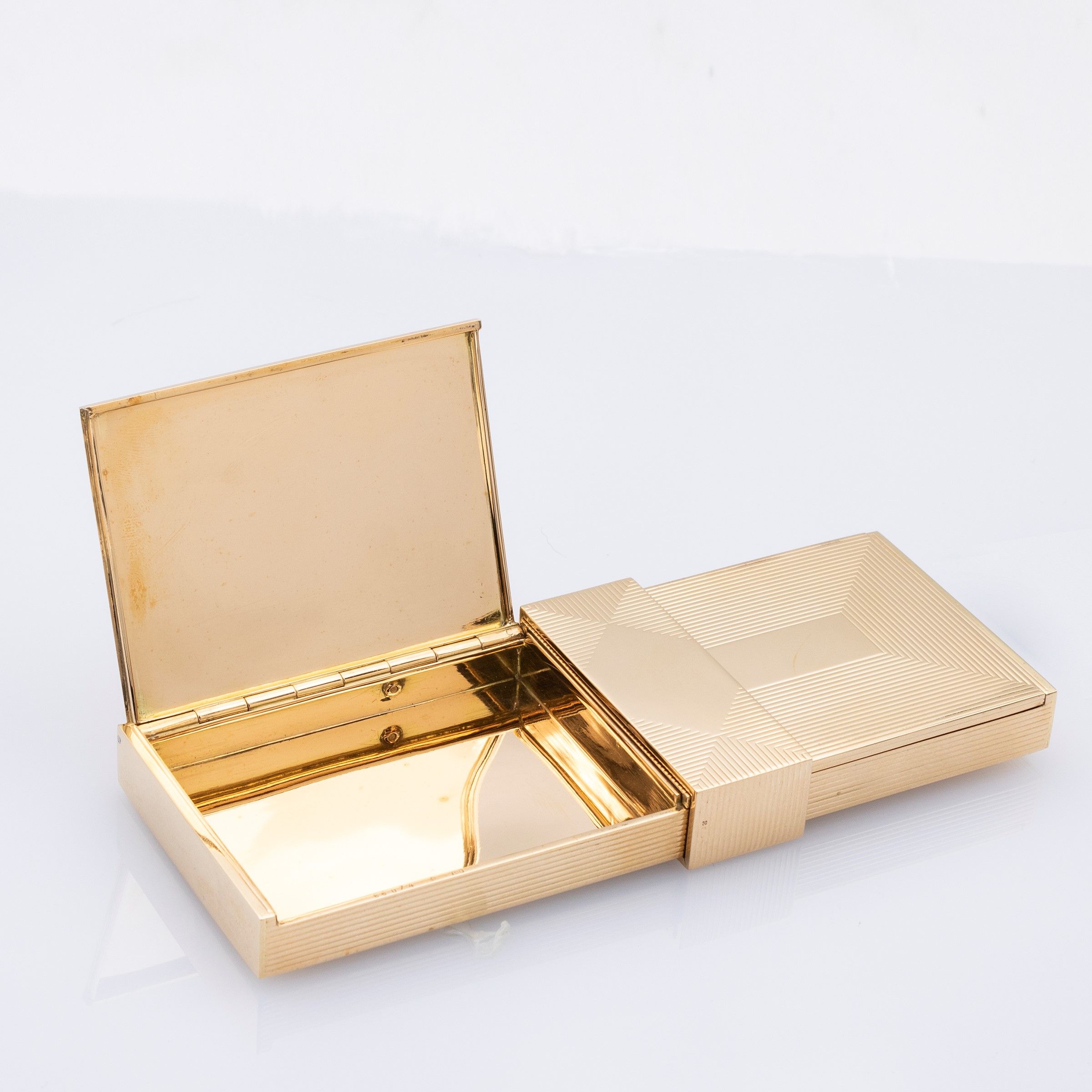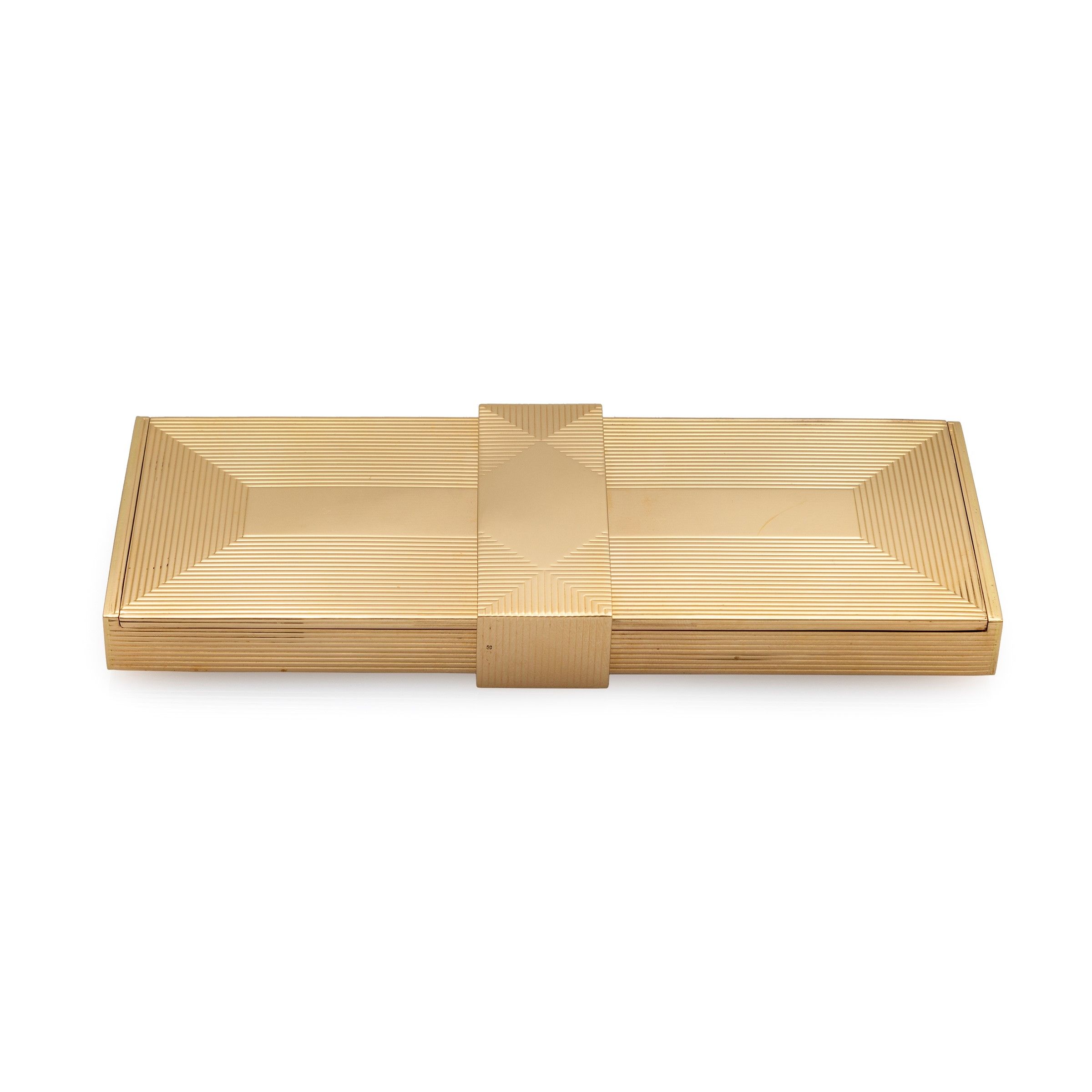 peso 307 gr. firmata e numerata, anni 40/50 di forma rettangolare a corpo liscio e rigato, interno a due scomparti di cui uno completo di portacipria e portarossetto, chiusura centrale scorrevole, misure 15,3x5,8x1,2 cm. completa di scatola originale