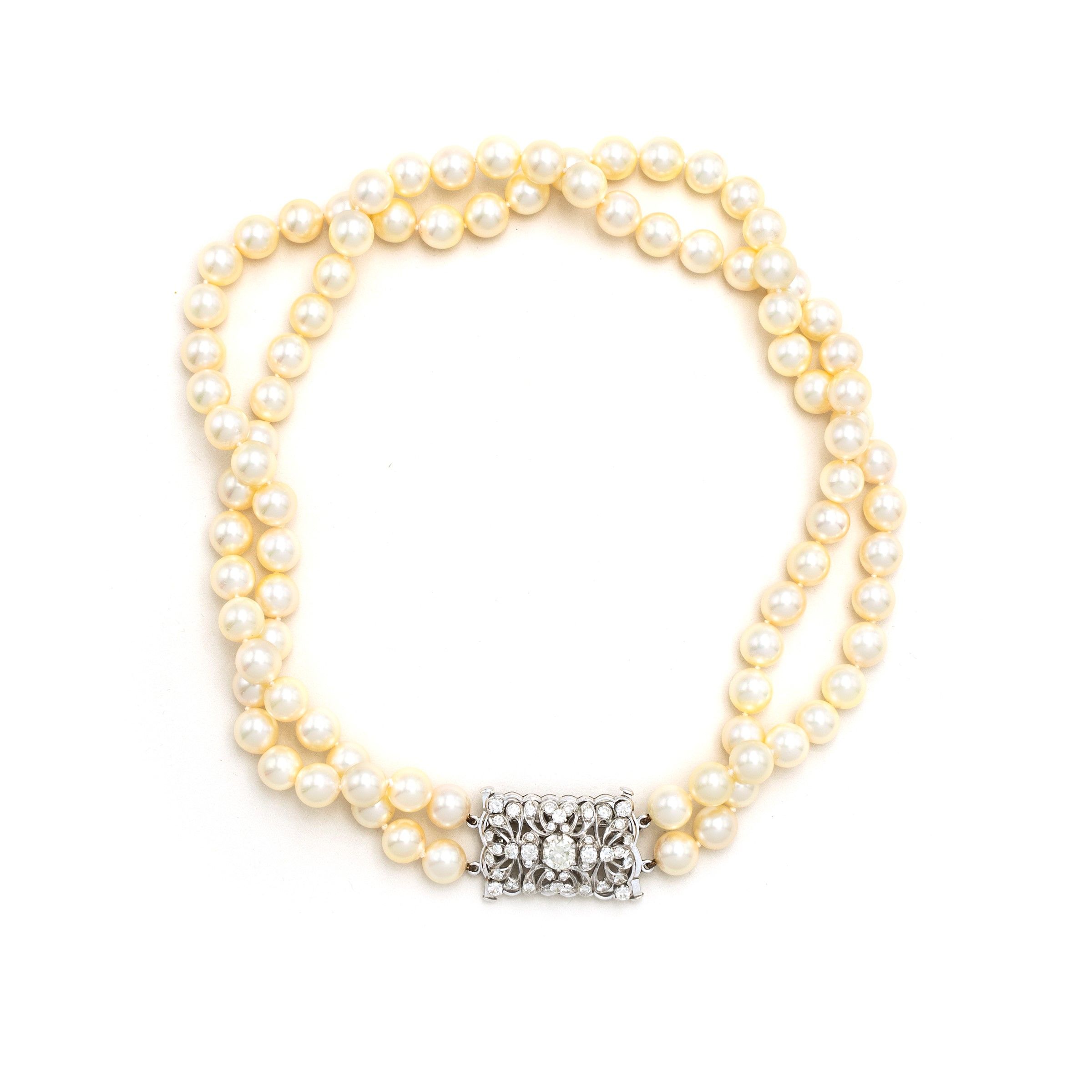 peso 114 gr. anni 40/50 di 9 mm. circa , misure 2,2x1,8 cm. riuniti da chiusura in oro bianco 18kt centrata da un diamante taglio brillante ct 0,80 circa e altri diamanti ct 1 circa, la chiusura é removibile e si può indossare come spilla, lunghezza 44 cm.