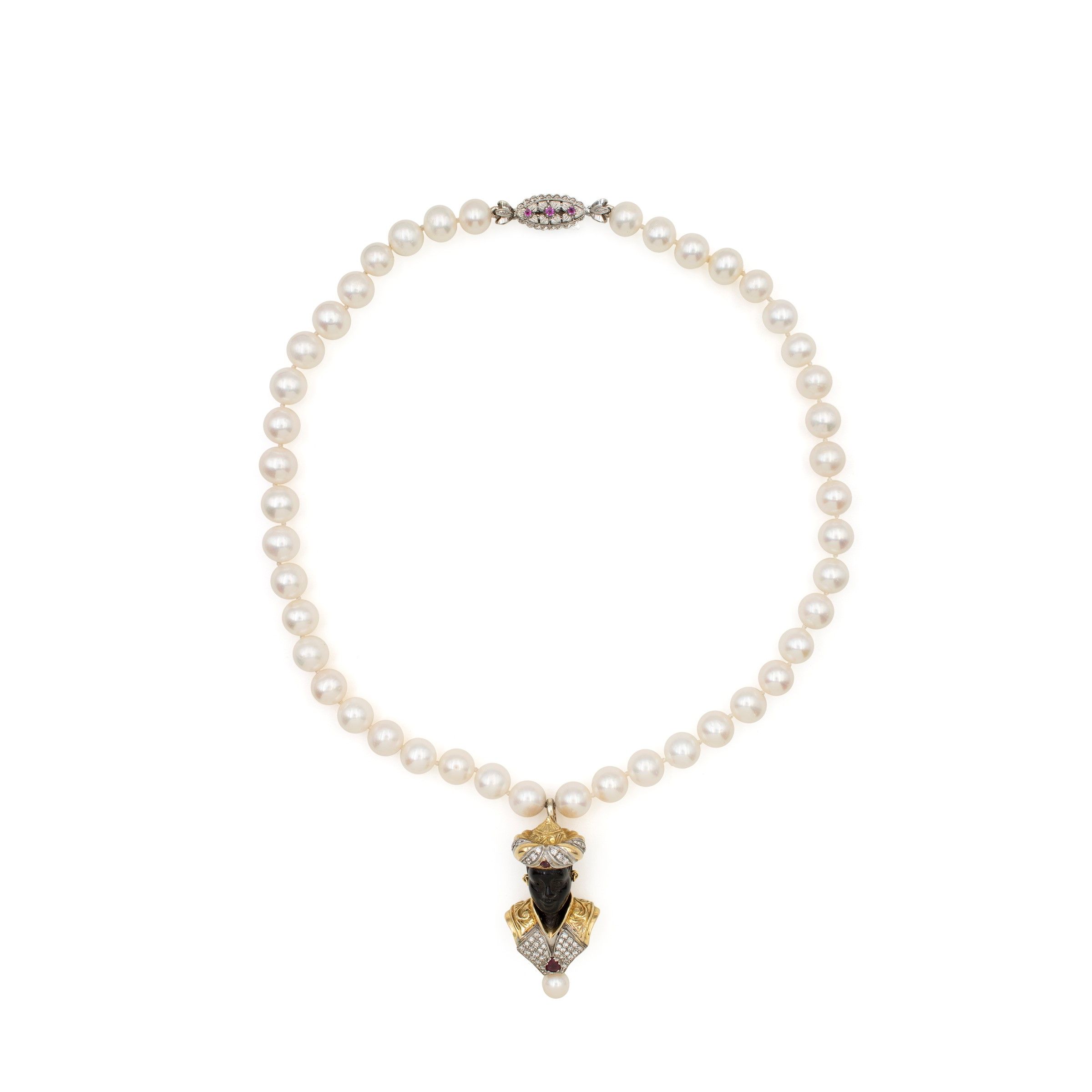 in oro giallo e bianco 18kt, legno ebanizzato, diamanti taglio brillante ct 0,50 circa e rubini, perle 9 mm. circa, chiusura in oro bianco con rubini, moretto misure 4,5x2,3 cm. collana lunghezza 42 cm.