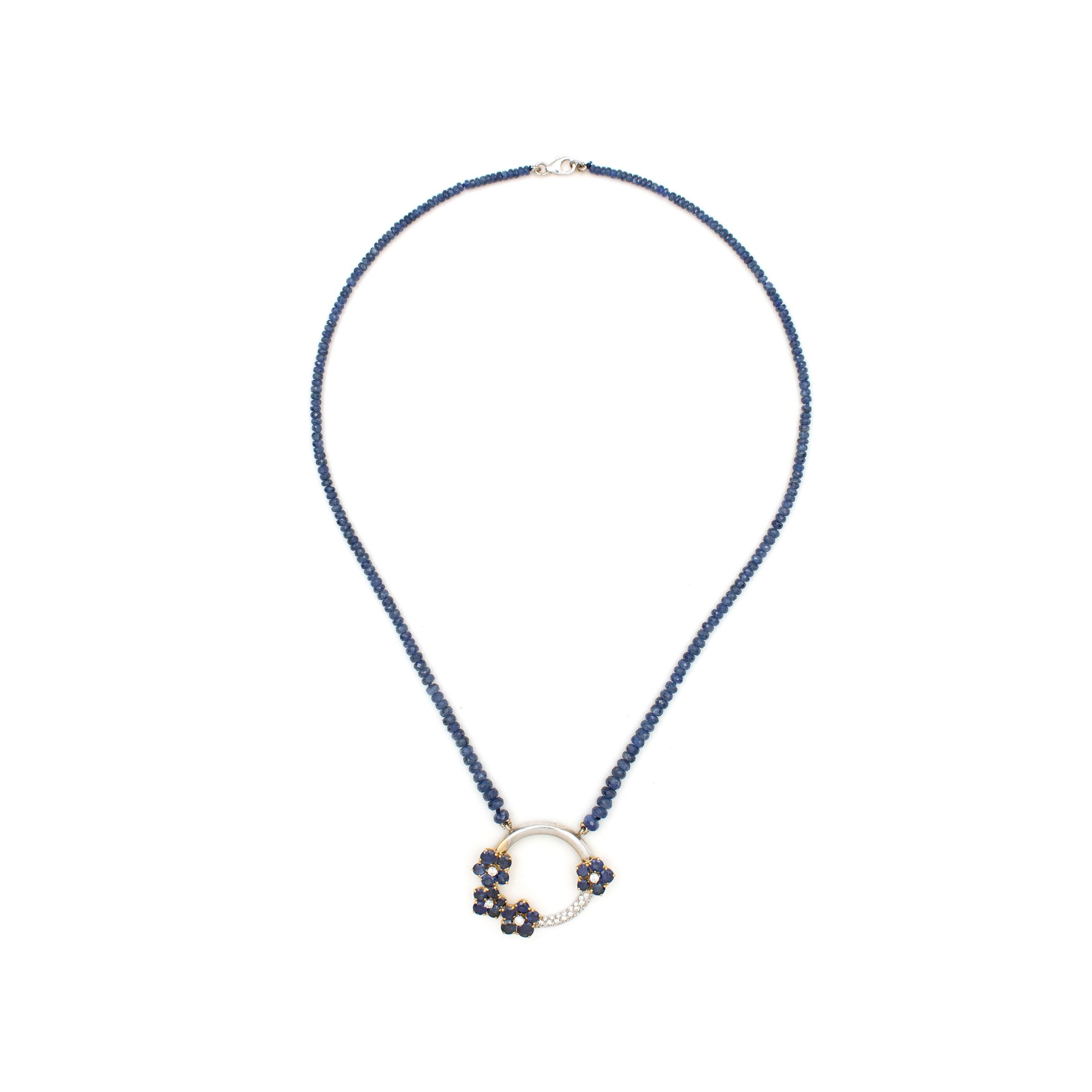 taglio briolet, pendente a motivo floreale in oro bianco e giallo 18kt zaffiri tondi ct 3 circa e diamanti taglio brillante ct 0,50 circa, lunghezza 45 cm.