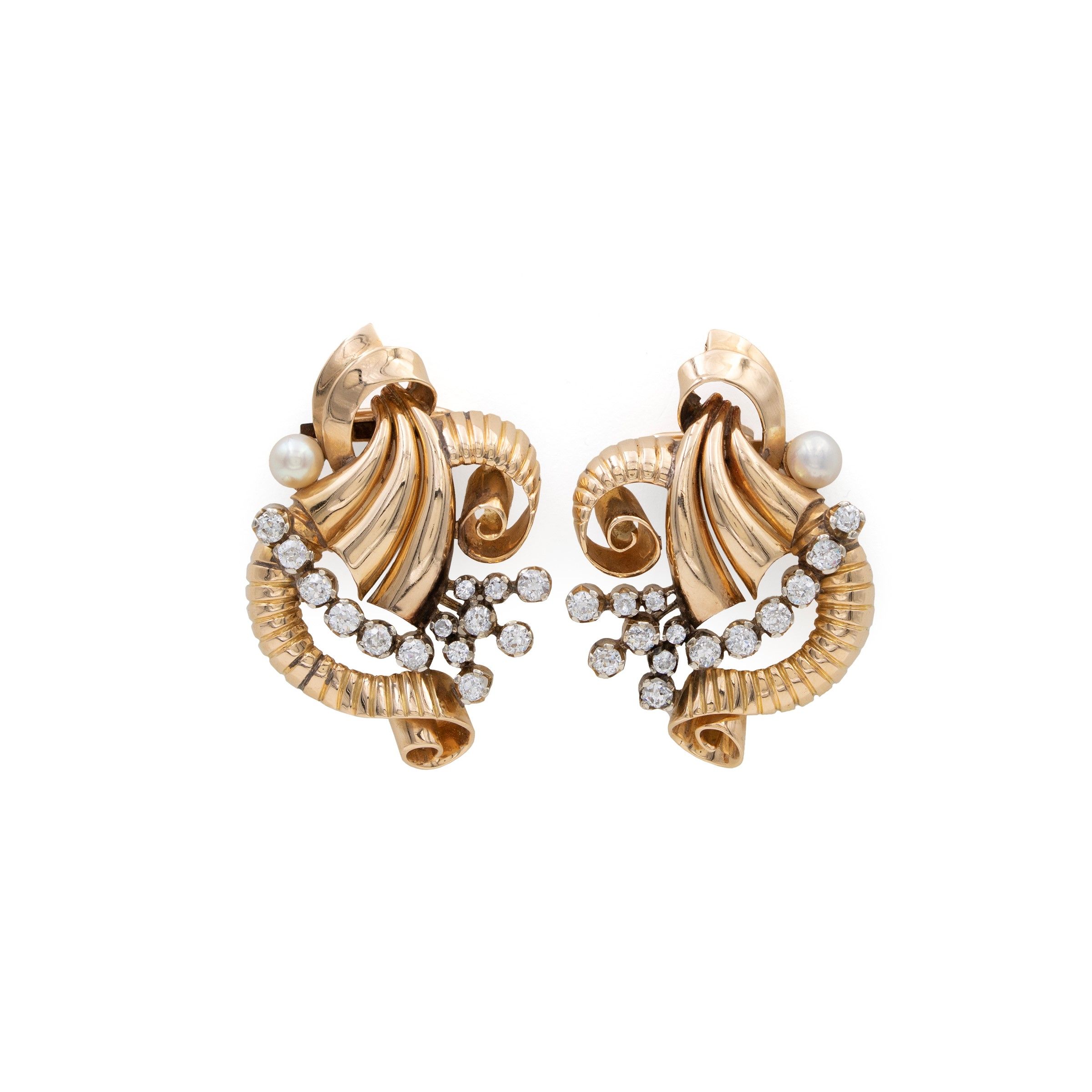 anni 40/50 taglio brillante antico ct 2,50 circa e due perle coltivate, misure 4,9x3,5 cm.