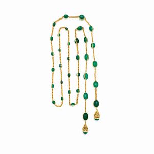 peso 134 gr. anni 70 circa taglio ovale cabochon disposto a gradazione, terminali pendenti in oro giallo filigrana, [..]