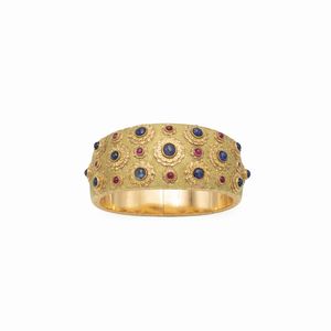 peso 100 gr. firmato, Roma anni 70 circa in oro giallo e rosa 18kt impreziosito da zaffiri e rubini taglio cabochon, [..]