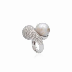 Anello in oro bianco 18kt con perla coltivata e diamanti