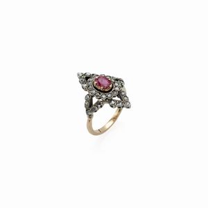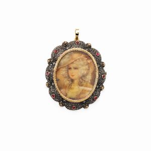 peso 22 gr. primi '900 impreziosita da rubini e rose di diamante, miniatura dipinta in policromia raffigurante [..]
