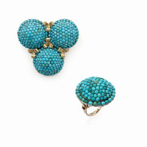 peso 45 gr. in oro e argento con turchesi naturali taglio cabochon, lievi difetti, misure spilla 4,6x4,8 cm. - [..]