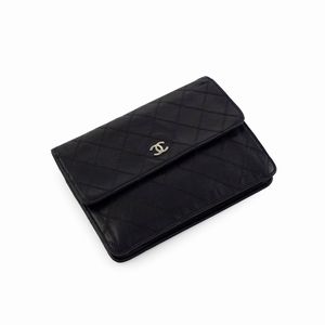 misure 17x13x4,5 cm. in pelle nera, finiture dorate, interno in pelle ad uno scomparto, una tasca a zip, tasca [..]