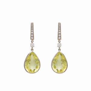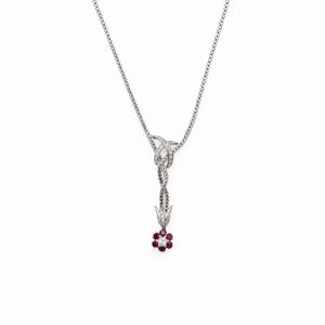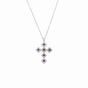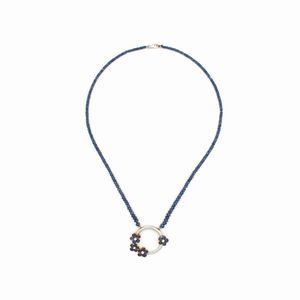 peso 19 gr. taglio briolet, pendente a motivo floreale in oro bianco e giallo 18kt zaffiri tondi ct 3 circa e [..]