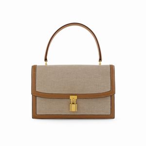 misure 27,5x19x5 cm. anni 90 circa in pelle beige e tela, finiture dorate, interno in pelle a due scomparti con [..]
