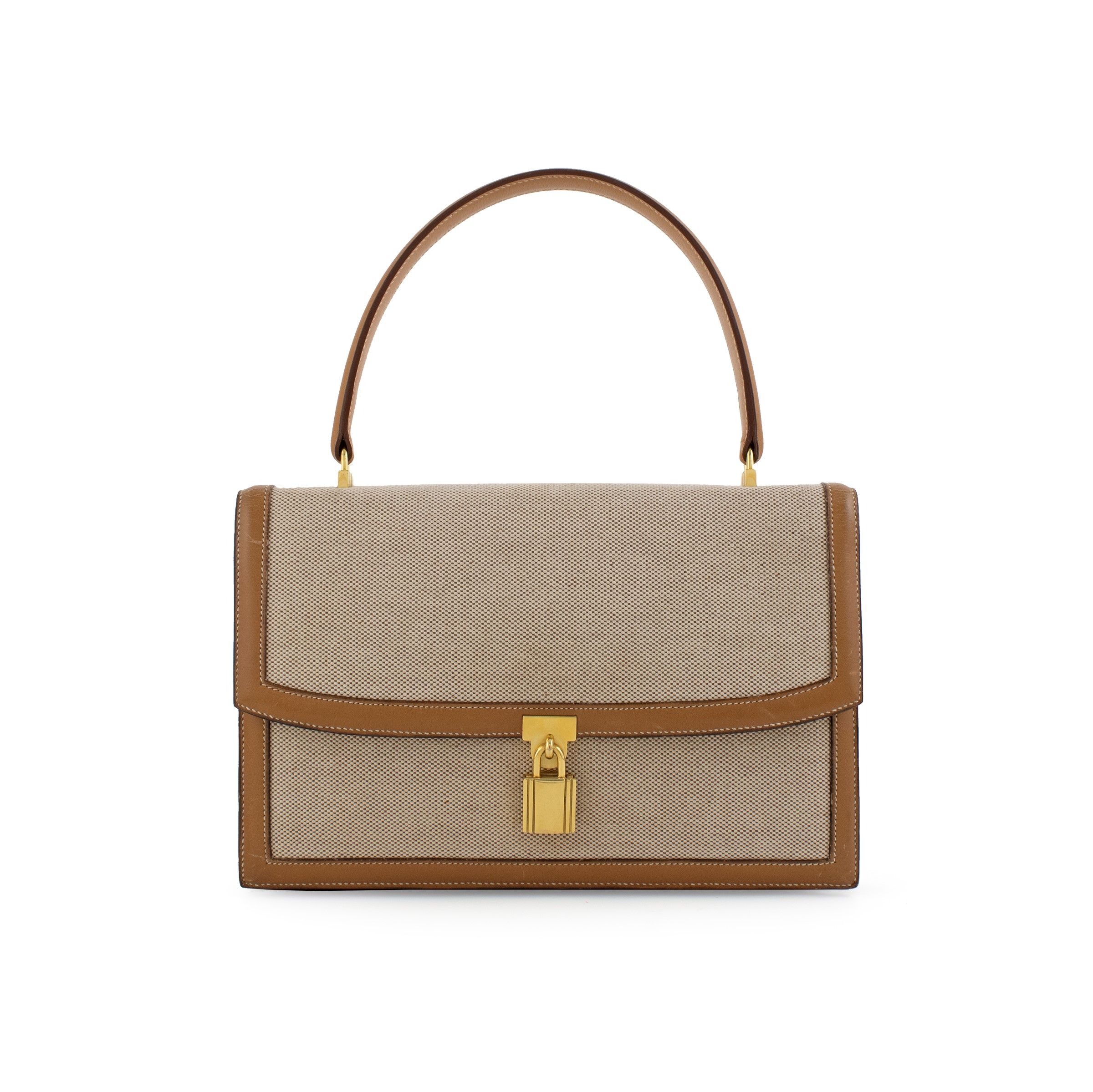 anni 90 circa in pelle beige e tela, finiture dorate, interno in pelle a due scomparti con quattro tasche, tasca esterna anteriore, manico in pelle, chiusura a patta con lucchetto scorrevole, segni di usura