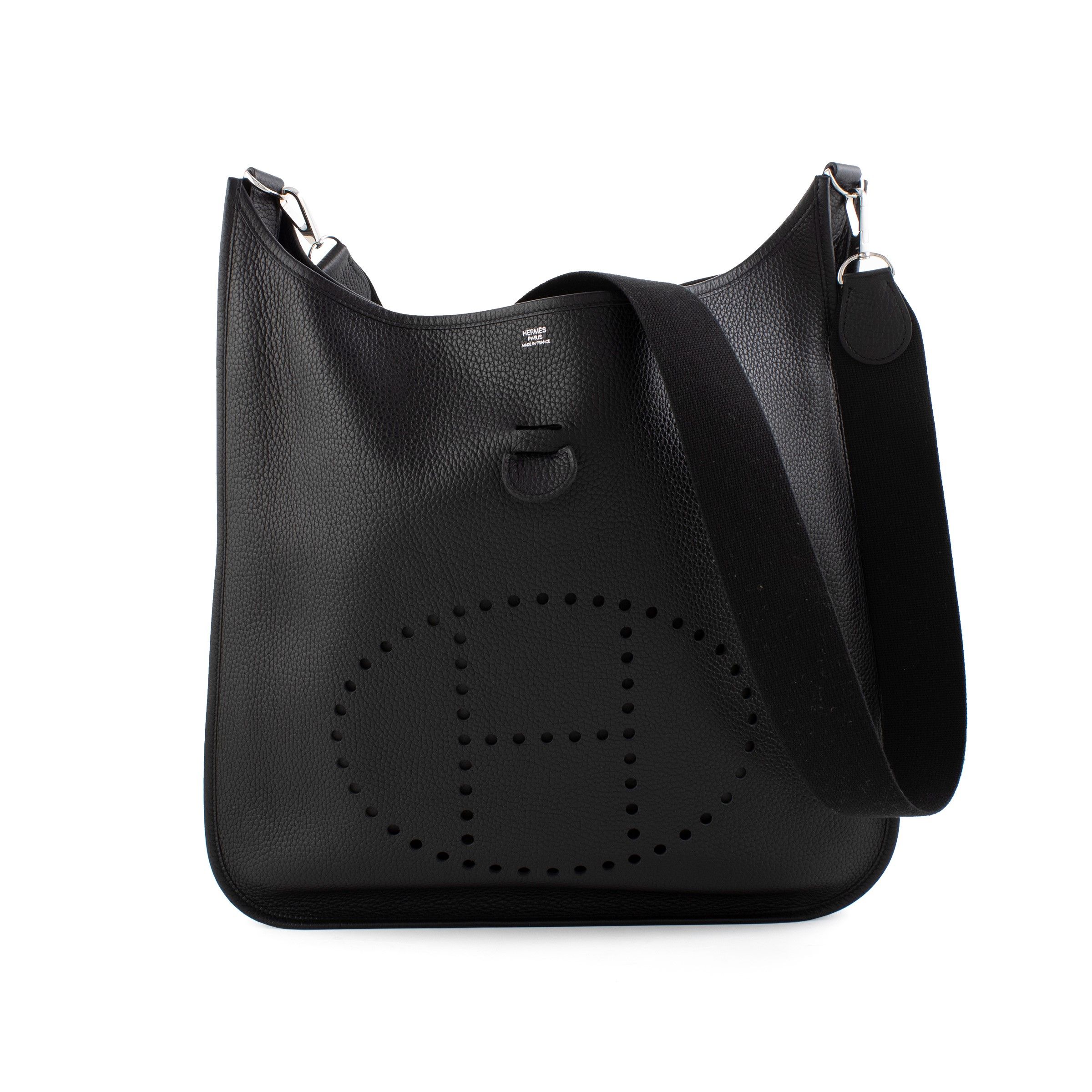 misure 40x42x10 cm. anno 2012 in pelle taurillon nera, finiture argentate, interno ad uno scomparto in pelle nera scamosciata, tasca esterna posteriore, chiusura a bottone con pressione, tracolla a spalla in tessuto e pelle, completa di scatola, condizioni buone
