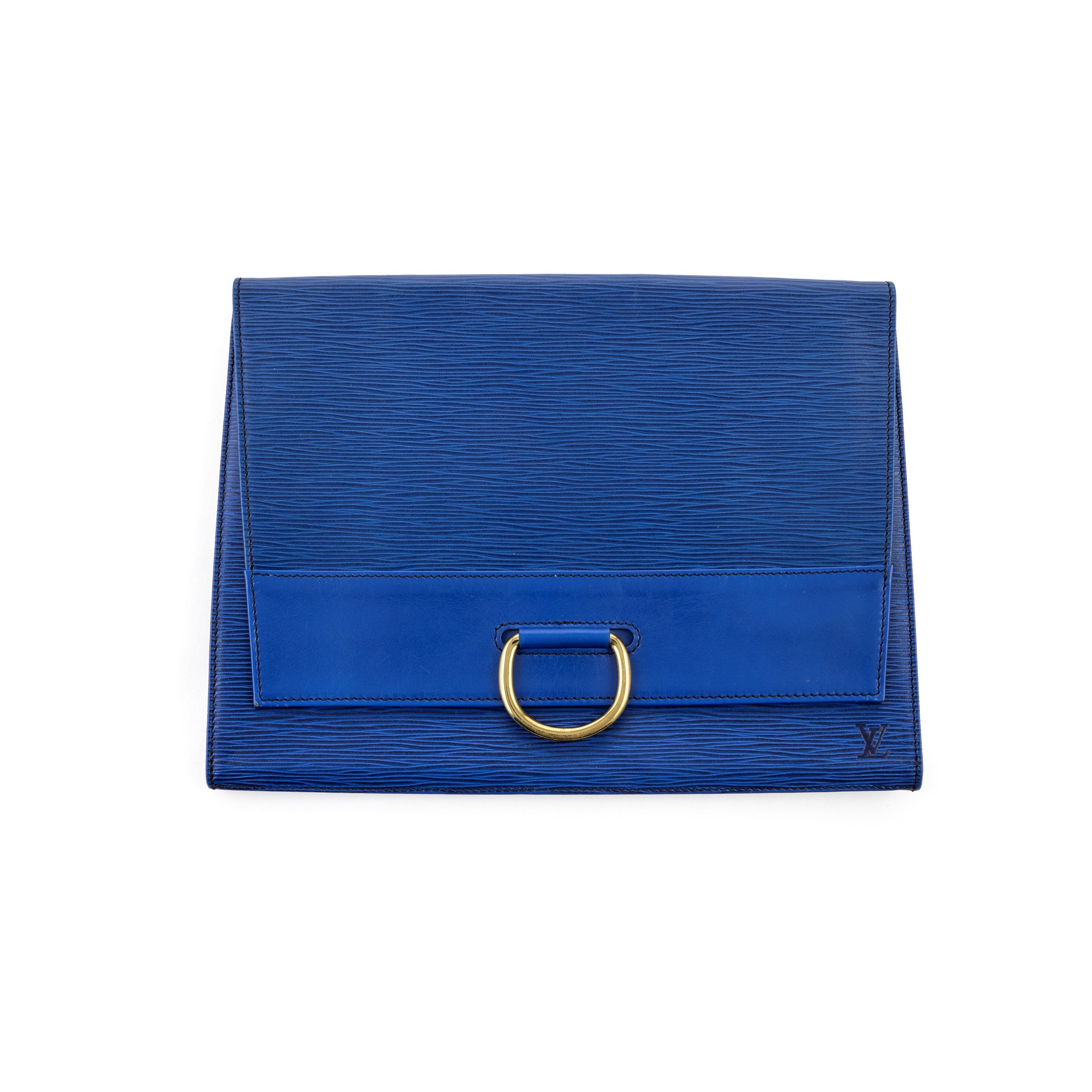 in pelle epi blu, finiture dorate, interno in pelle ad uno scomparto con tasca, chiusura a patta con staffa, tasca interna, segni di usura