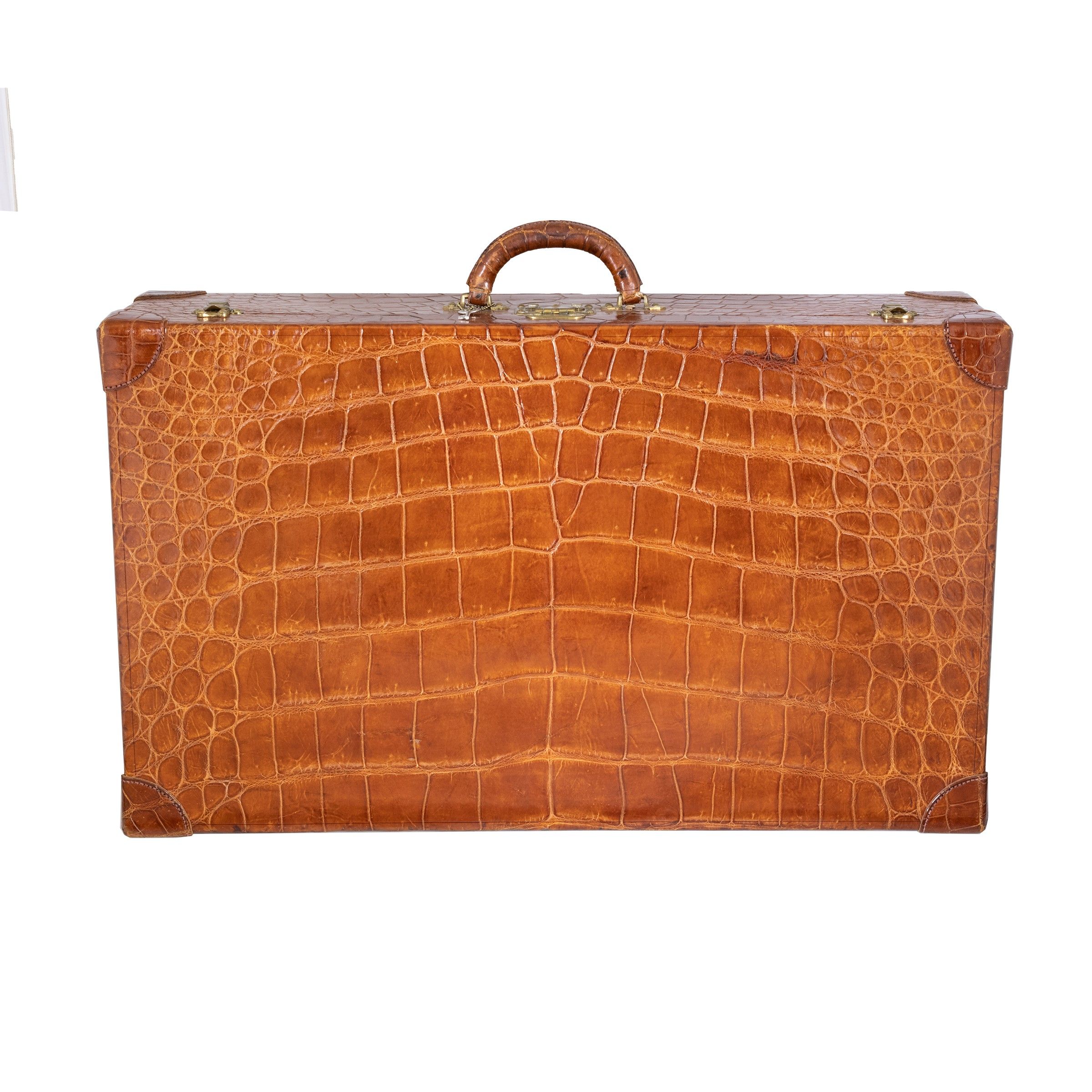 misure 80x48x22 cm. anni 30/40 firmata e numerata in coccodrillo marrone, finiture in pelle e ottone dorato, interno in pelle verde a due scomparti con divisore removibile e cinghie in pelle, tre chiusure a lucchetto di cui la centrale con chiavi, manico rigido in coccodrillo, completa di custodia originale in tessuto e coccodrillo che presenta segni di usura