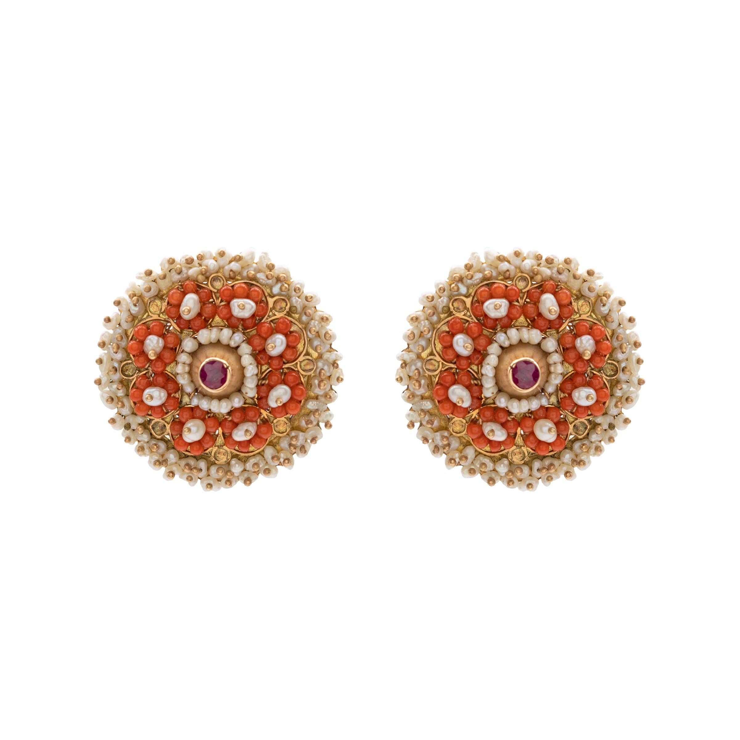 Orecchini a lobo in oro giallo 12kt corallo e perline