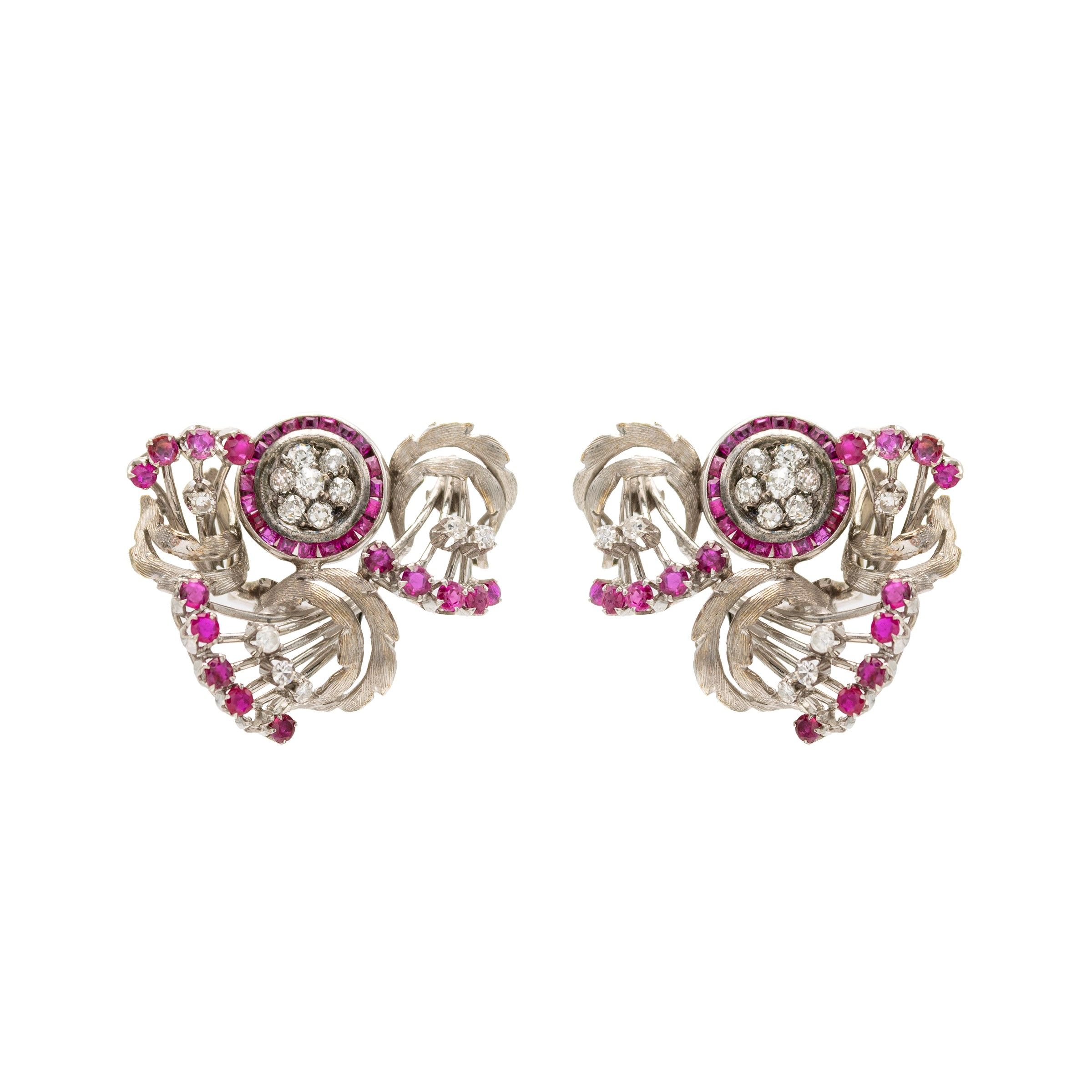 anni 40/50 diamanti taglio brillante ct 0,60 circa e rubini tondi e taglio carré ct 1 circa, misure 3x2,5 cm.
