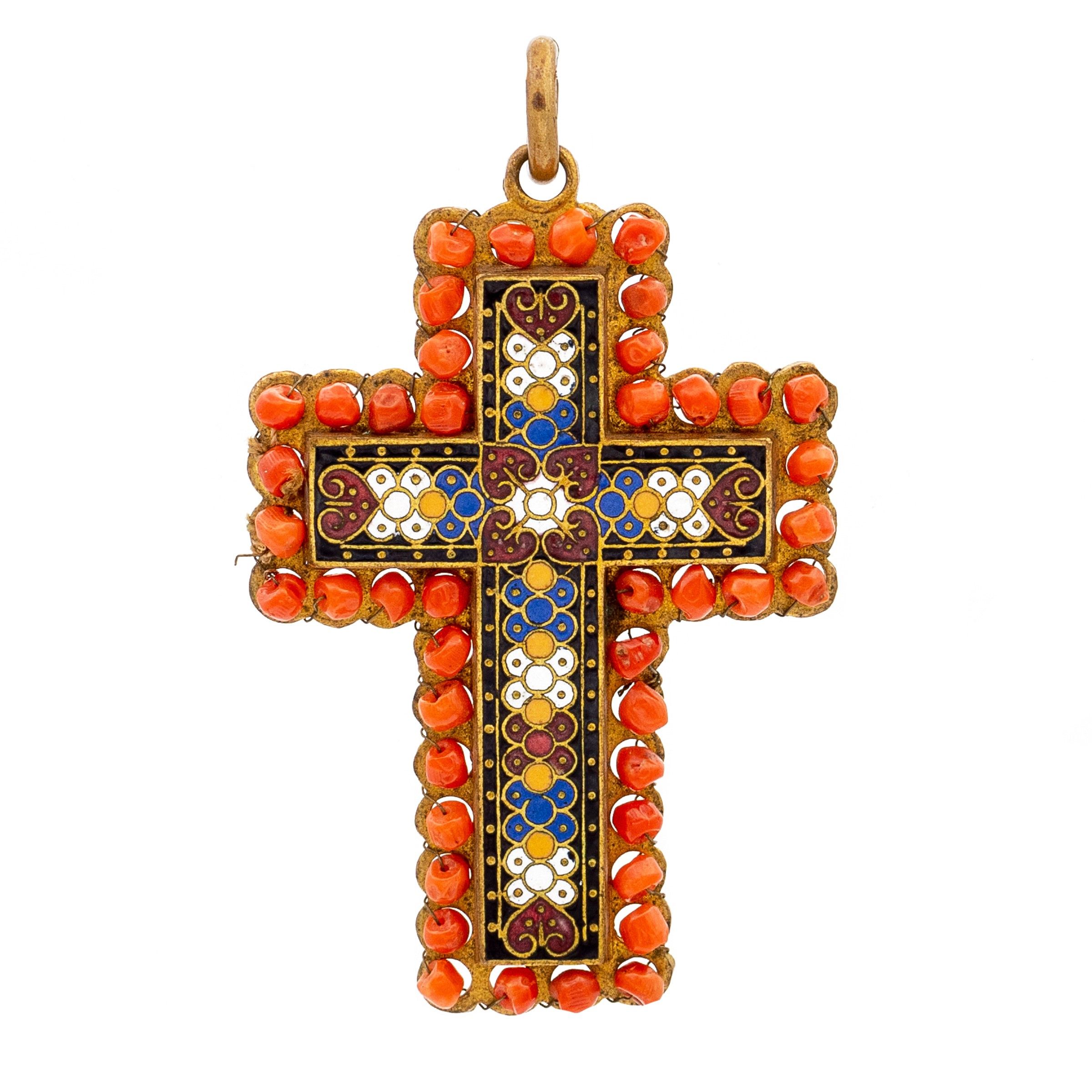 decorato con smalti policromi e coralli, misure 6x4 cm.