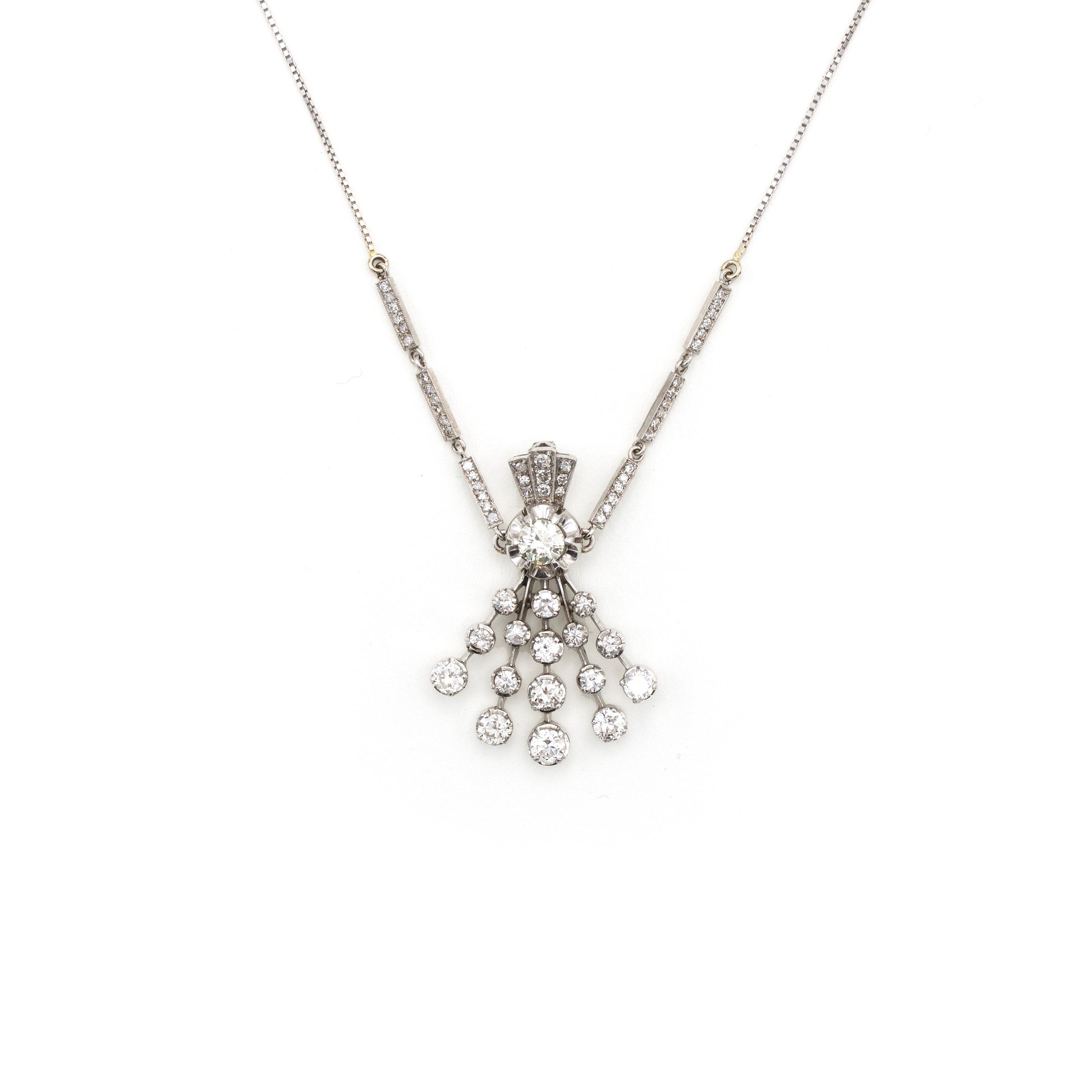 anni 40/50 taglio brillante ct 2,20 circa e diamanti taglio brillante antico, completo di collanina in oro bianco18kt lunghezza 45 cm.