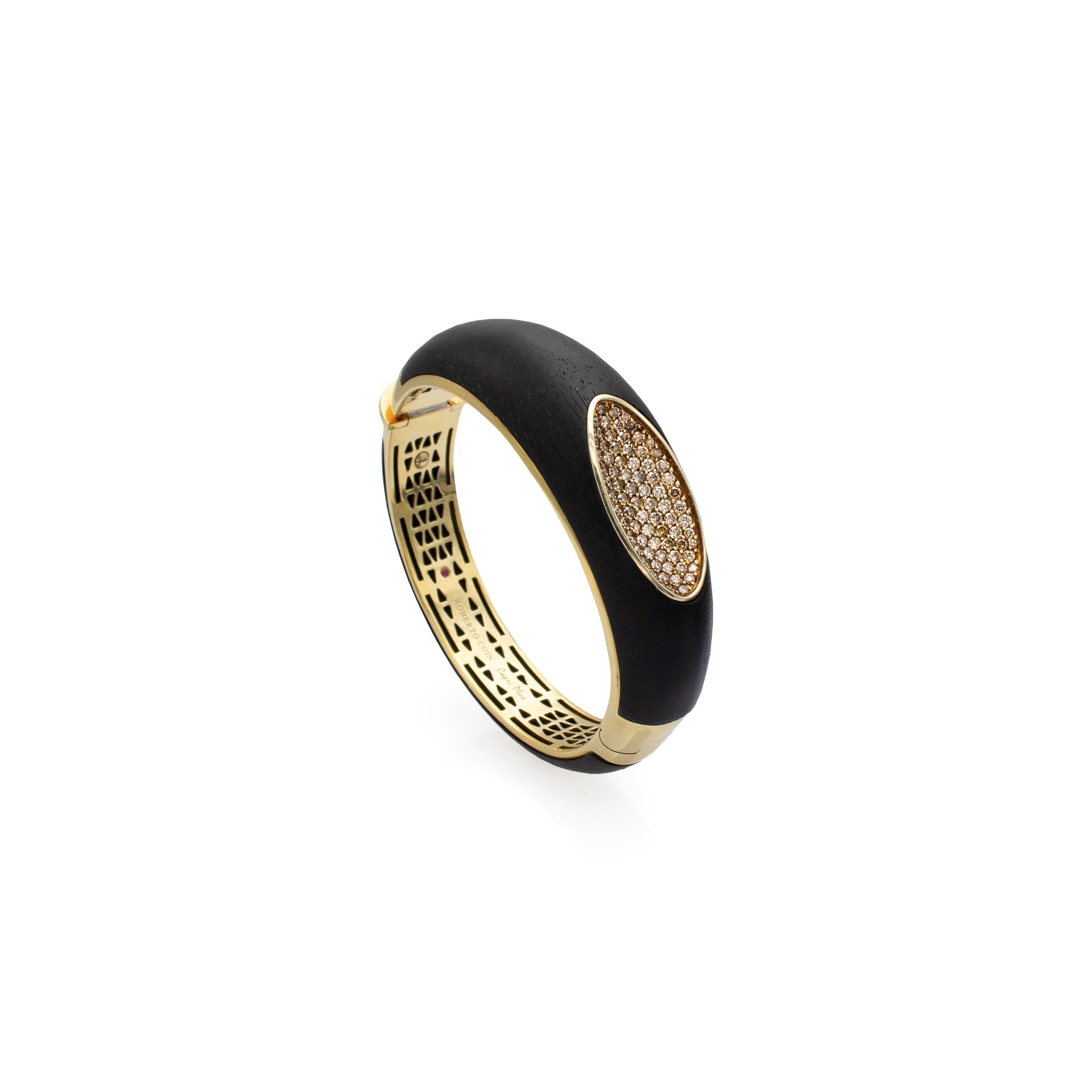firmato in argento placcato oro e legno ebanizzato impreziosito da diamanti taglio brillante ct 2,50 circa, chiusura a scatto, diametro 6 cm.