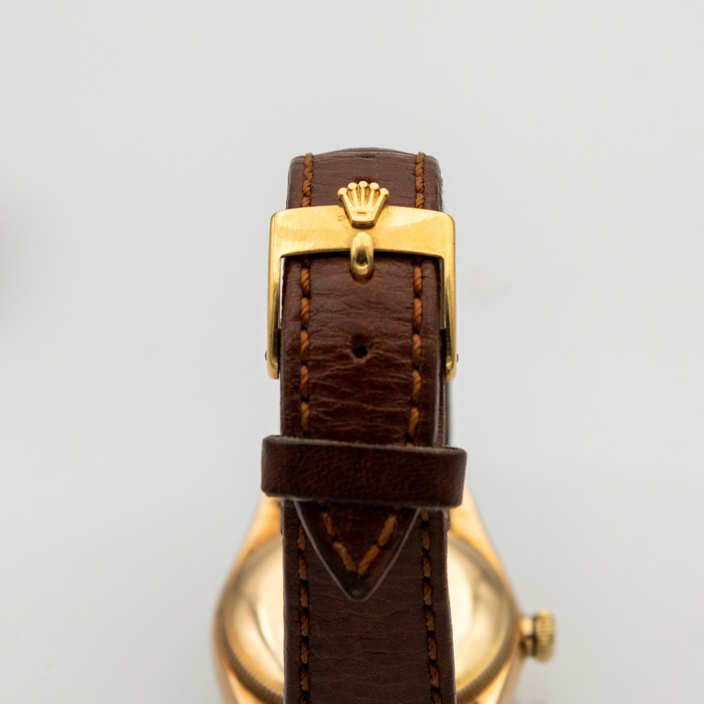 anni 40 circa in oro giallo 18kt, ref. 3131, cassa tonda 32 mm. quadrante bianco con numeri arabi, corona originale, movimento meccanico a carica automatica, calibro 635, cinturino in pelle con fibbia originale in oro giallo 18kt, cassa quadrante e movimento firmati, completo di scatola