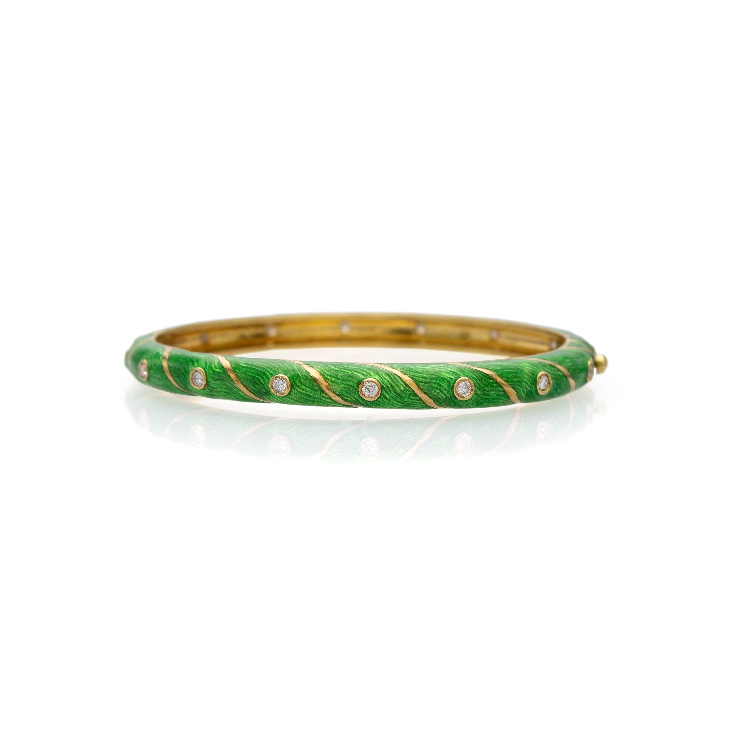 firmato in oro giallo 18kt, smalto verde e diamanti taglio brillante ct 0,45 circa, chiusura a scatto, diametro 6 cm.