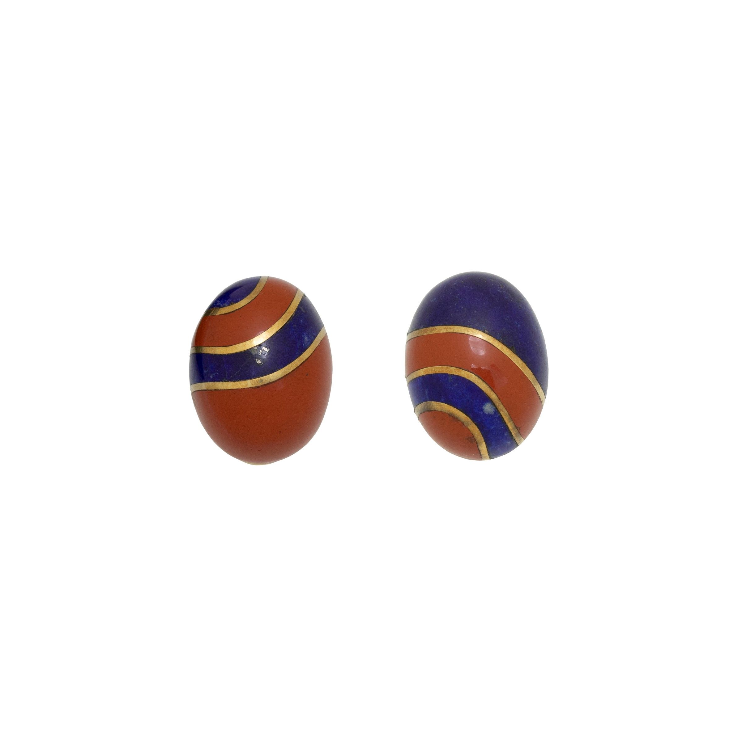 firmati, anni 70 circa in oro giallo 18kt diaspro e lapislazzulo, lievi difetti, misure 1,8x2,2 cm.