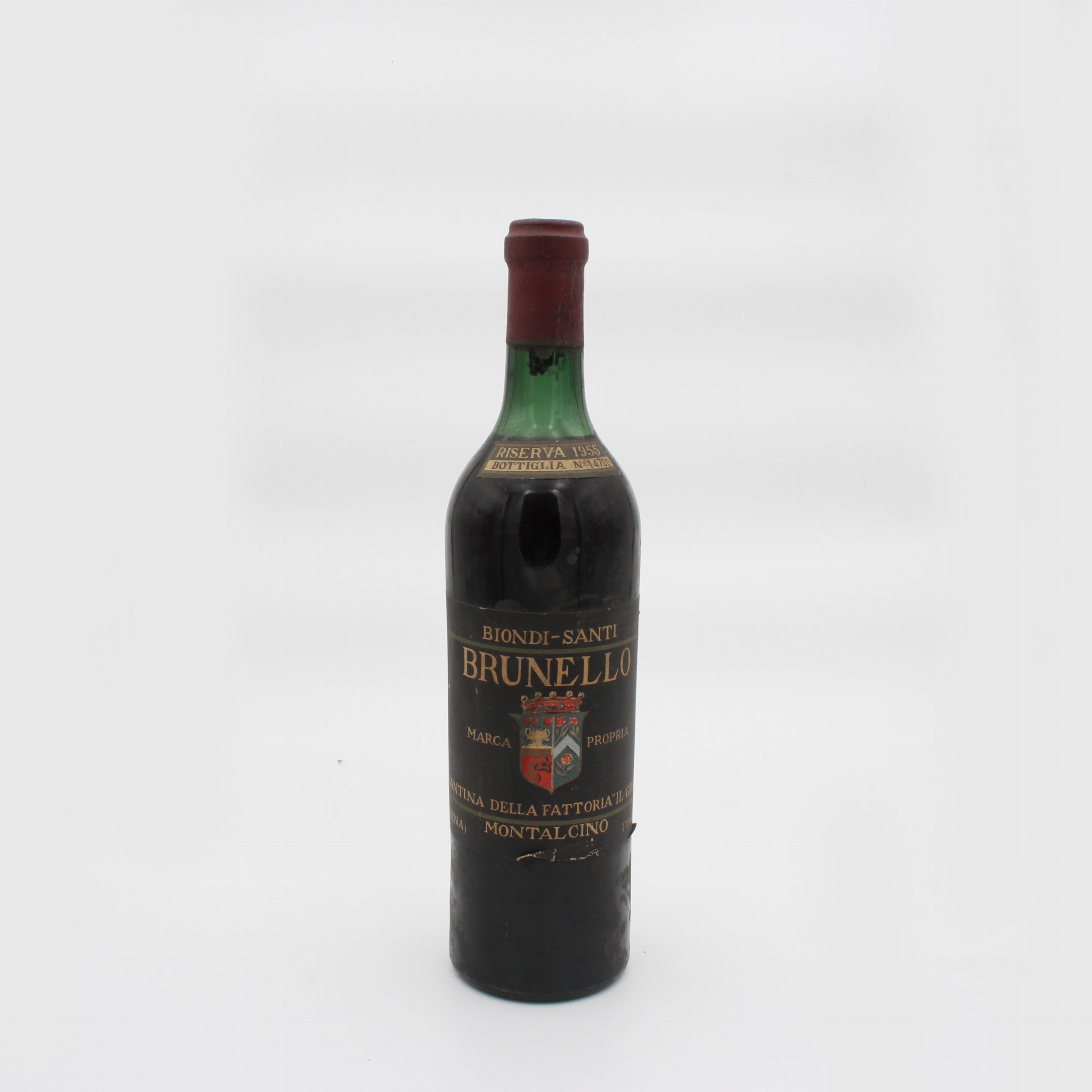 Brunello di Montalcino 1955(Annata eccezionale), Biondi Santi Toscana – Montalcino (Siena) Livello colmatura: - (1 bt) La storia del Brunello di Montalcino è indissolubilmente legata a quella dei Biondi Santi. Ferruccio a metà dell’800 pianṭ il primo vigneto di Brunello, ottenuto da un clone di Sangiovese. La prima citazione di un rosso secco è del 1869 quando suo nonno Clemente vinse 2 medaglie per il suo Brunello a una fiera agricola. Ferruccio fu garibaldino e poi intelligente vitivinicoltore e coś nei decenni la fama dei Brunello Biondi Santi in Italia e nel mondo fece da traino a molti altri bravi produttori. Una cassa di Brunello 1955 fu donata nel 1969 dal presidente Saragat alla regina Elisabetta II in occasione di una cena di gala.