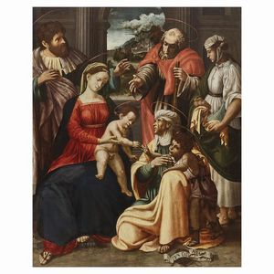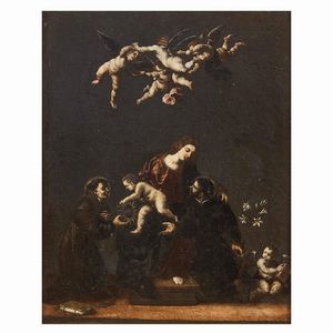 Artista francese, sec. XVII MADONNA COL BAMBINO E SANT'ANNA olio su rame, cm 28,5x23,5 French Artist, 17th century [..]