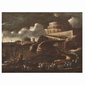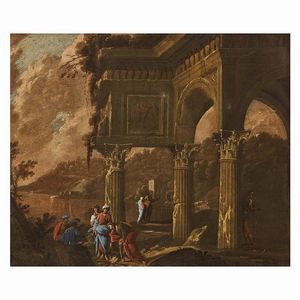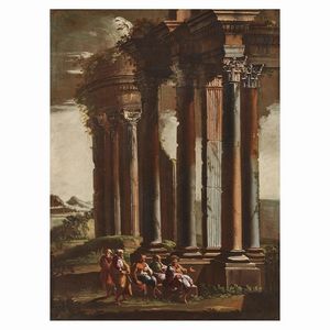 Artista francese a Roma, sec. XVII ARCHITETTURE CON FIGURE olio su tela, cm 89,5x68 French Artist in Rome, 17th [..]