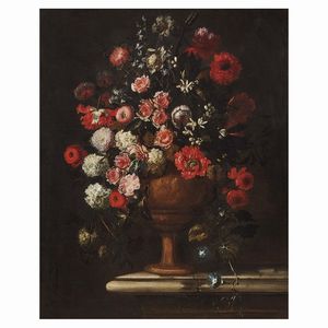 Bartolomeo Bimbi (Settignano, 1648 - Firenze, 1729) VASO DI FIORI SU BASAMENTO olio su tela, cm 128,5x104 [..]