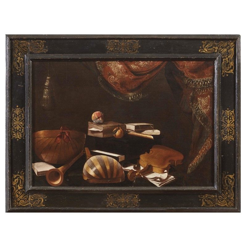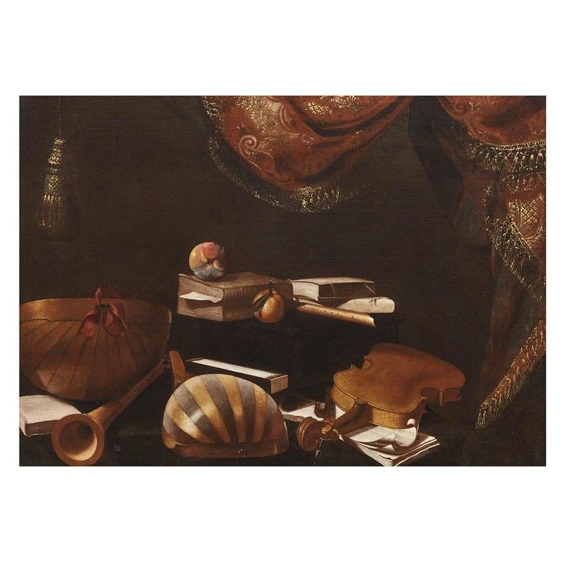 Diverso anche il colore e il drappeggio della tenda che inquadra la scena nella tela citata, e che la differenzia da un’altra versione – verosimilmente più antica – a Bergamo in collezione privata dalla raccolta Haussman, più austera nella presentazione dei soli strumenti musicali (cfr. M. Rosci, Il primato del Baschenis, in Baschenis e la natura morta in Europa, 1996, cit., p. 42, fig. 3).