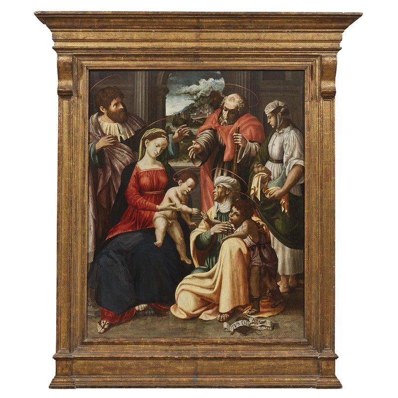 Vari i riferimenti dell’artista in questa pala domestica: curioso il recupero di un modello düreriano, verosimilmente mediato da un’incisione, nel paesaggio di sfondo, motivo nordico incorniciato in modo incongruo da un arco trionfale di impeccabile classicismo, come pure gli altri motivi scultorei dall’antico che incorniciano le due famiglie.