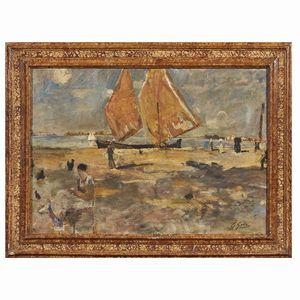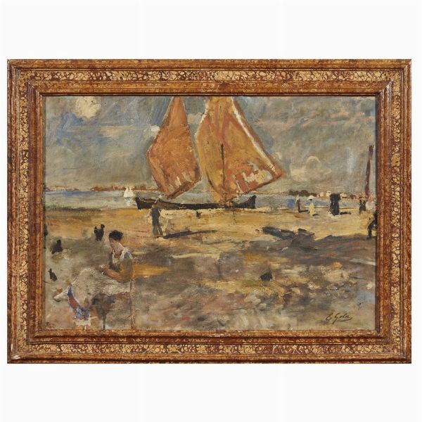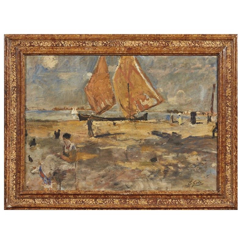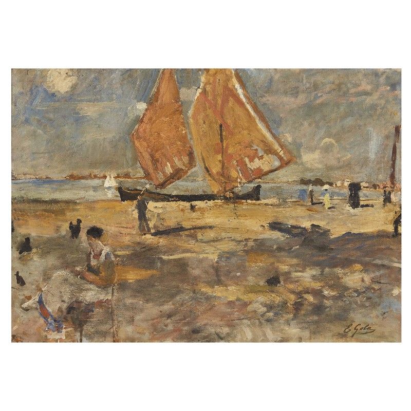 Una brezza leggera immaginiamo accarezzare la spiaggia di Chioggia dipinta del pittore Emilio Gola, ove l’impasto di colore sembra recare con sé il profumo di salsedine. Abile ritrattista, assai apprezzato dalla nobiltà milanese per l’accento mondano e il vigoroso naturalismo della propria pittura, l’artista compì viaggi studio nei Paesi Bassi, in Inghilterra e Parigi, ove conobbe Édouard Manet. La sua spiccata sensibilità luministica e plastica caratterizzerà numerose vedute di Milano e dei paesaggi brianzoli, nonché la produzione ligure e veneta. Ed è certo proprio nelle marine che si impone una grande sintesi formale e intensità espressiva, caratterizzante soprattutto la fase della maturità, in cui è possibile collocare la mirabile veduta della spiaggia Chioggia presentata in catalogo.