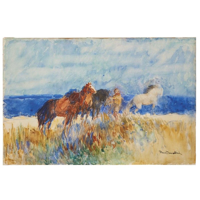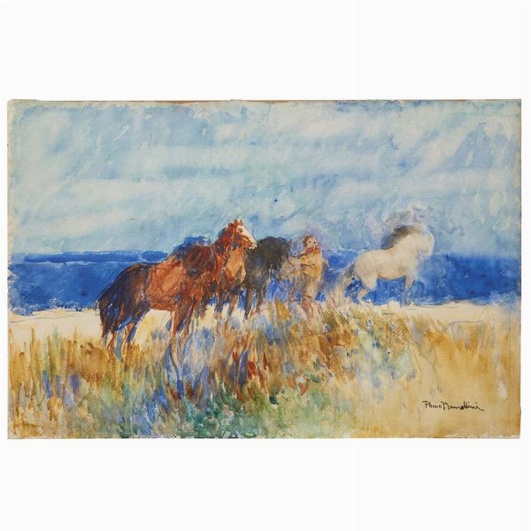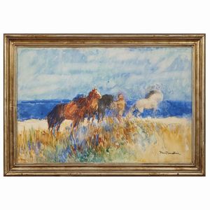 on the reverse: three stamps and label of Galleria d'Arte Ballerini in Prato, signed by Andrea Ballerini on 29/02/1979; inscribed Plinio Nomellini/ Cavalli al mare