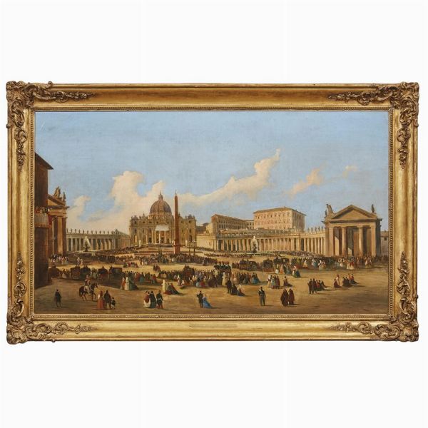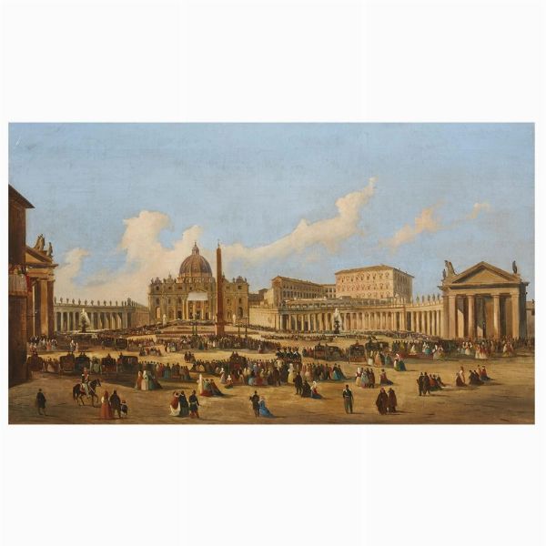 L’autore della cristallina veduta di Piazza San Pietro presentata in catalogo è il pittore Vincenzo Giovannini, trasferitosi giovanissimo da Todi a Roma. Formatosi dunque nella Capitale frequentando i corsi di disegno e pittura presso l’Ospizio di San Michele, l’artista, nonché abile copista, si specializzò presto nella pittura di vedute, assai richiesta da mercanti e in grado di esercitare un intramontabile fascino sui viaggiatori.