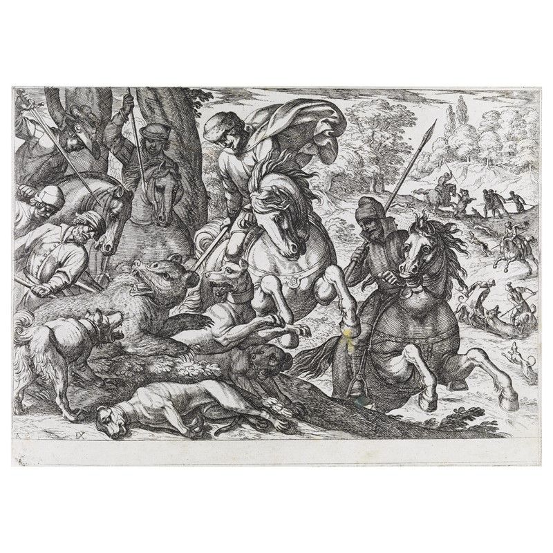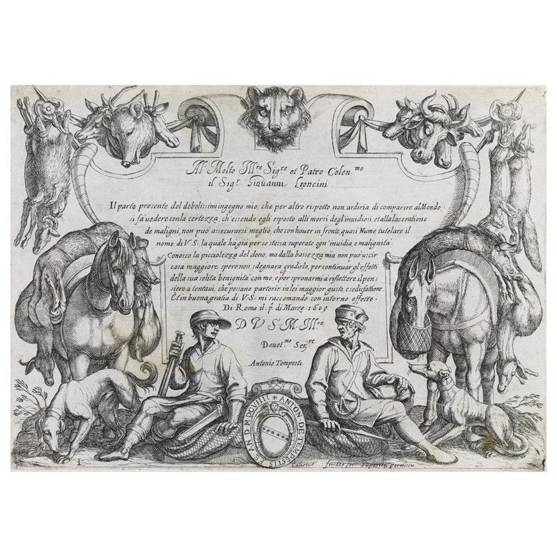 Antonio Tempesta (Firenze 1555 – Roma 1630) DIVERSE CACCE DI ANIMALI. 1609 album contenente serie completa e omogenea di 9 tavole e un frontespizio nel I stato su 2 con l’indirizzo di Calisto Ferrante (poi sostituito con quello di Domenico de Rossi) e dedica a Giovanni Leoncini, acquaforte su carta vergellata, mm 205x285 circa