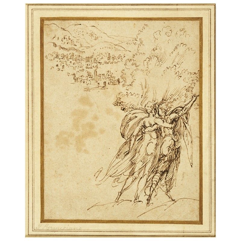 Secondo Mario Di Giampaolo, che lo riteneva di mano del Bertoja, il foglio è da collocare nel momento della decorazione del Palazzo del Giardino a Parma in cui l’artista parmense si trova a collaborare con Girolamo Mirola. In particolare, convincente è il confronto con le due figure abbracciate nella parete nord della sala dell’Ariosto, ormai però considerate di Mirola. Una recente mostra ha infatti cercato di fare distinzione fra le due personalità, spesso confuse, anche a livello disegnativo (La maniera emiliana: Bertoja, Mirola, da Parma alle corti d’Europa, Fontanellato (Parma), 2019): se entrambi sono affascinati dalle eleganze lineari di Parmigianino, il tratteggio che ombreggia le forme di Mirola è molto più deciso a seguire gli andamenti delle forme e tipici sono le sue capigliature ondulate, caratteristiche che si riscontrano anche nel nostro disegno.