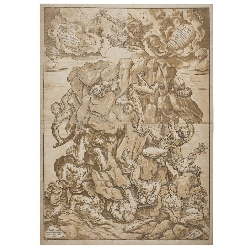 Bella prova tirata in inchiostro bruno e in due toni più chiari per il fondo e le ombreggiature. Si tratta del secondo e definitvo stato del soggetto ideato da Guido Reni e precedentemente inciso dallo stesso Coriolano nel 1638: è generalmente considerata la versione migliore e pertanto inclusa tra i capolavori della storia dell'incisione xilografica. Compaiono le seguenti iscrizioni "Terra Parens Quondam Coelestibus Invida Regnis. Claud. Gigantom", nel foglio in alto a sinistra.